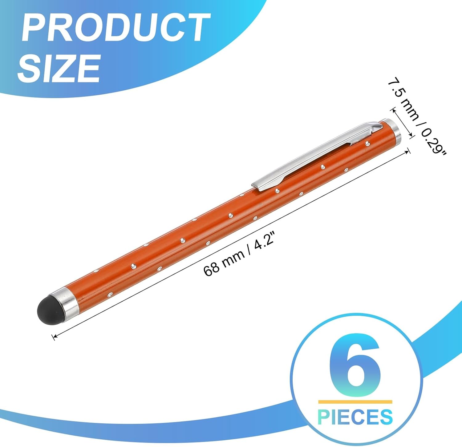 - Color: Orange; Materials: Metal; Rubber; Length: 68 mm / 4.2 inch; Diameter: 7.5 mm / 0.29 inch; Packing List: 6 Pcs x Shimmering Crystal Capacitive Pen