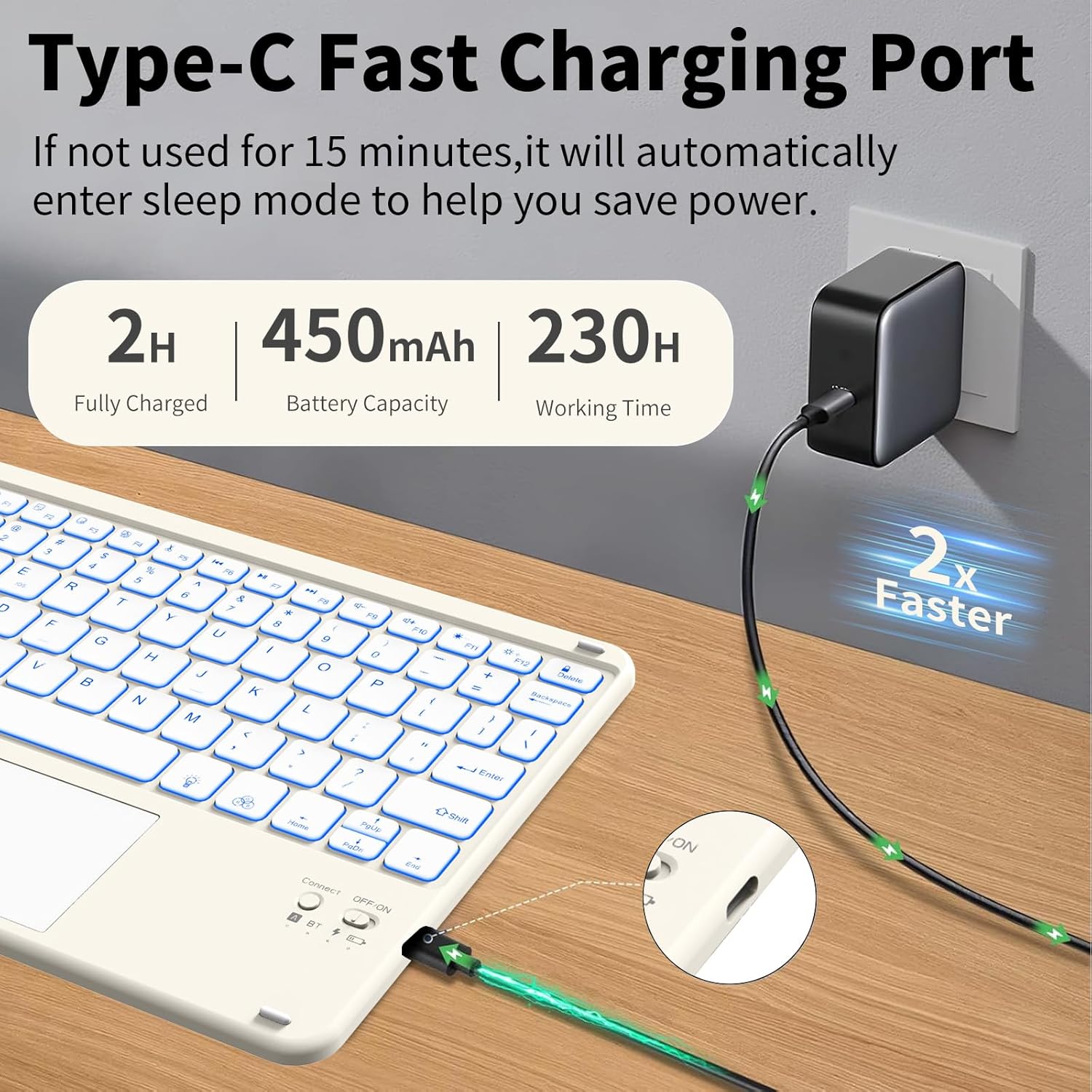 - 【Detachable Magnetic Keyboard with 7-Color Backlight】 Features a wireless Bluetooth keyboard with magnetic attachment/detachment functionality. Customizable 7-color RGB backlight with 3 brightness levels enables comfortable typing in low-light environments.You can choose your favorite color, bringing you different visual enjoyment. Ergonomic and mechanical scissor keys with rebound feature to reduce noise, enjoy comfortable typing even long hours