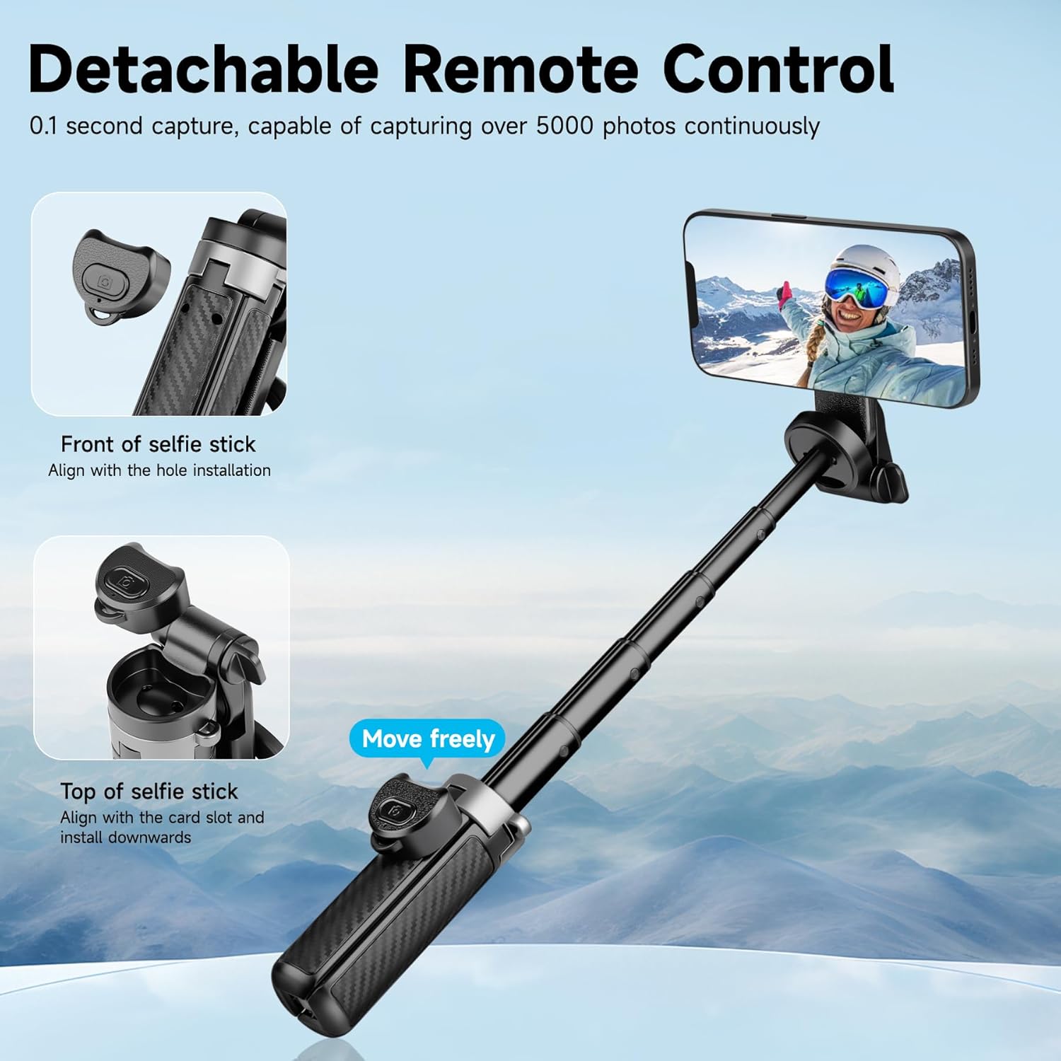 - 【Easy Framing & Remote Control】Quickly pairing, allowing you to focus on enjoying the experience while still capturing it all. The remote is an insert-type design, which is less likely to fall off. With a remote control distance of 10 meters make it easy to capture the perfect picture whether you are alone or with friends.