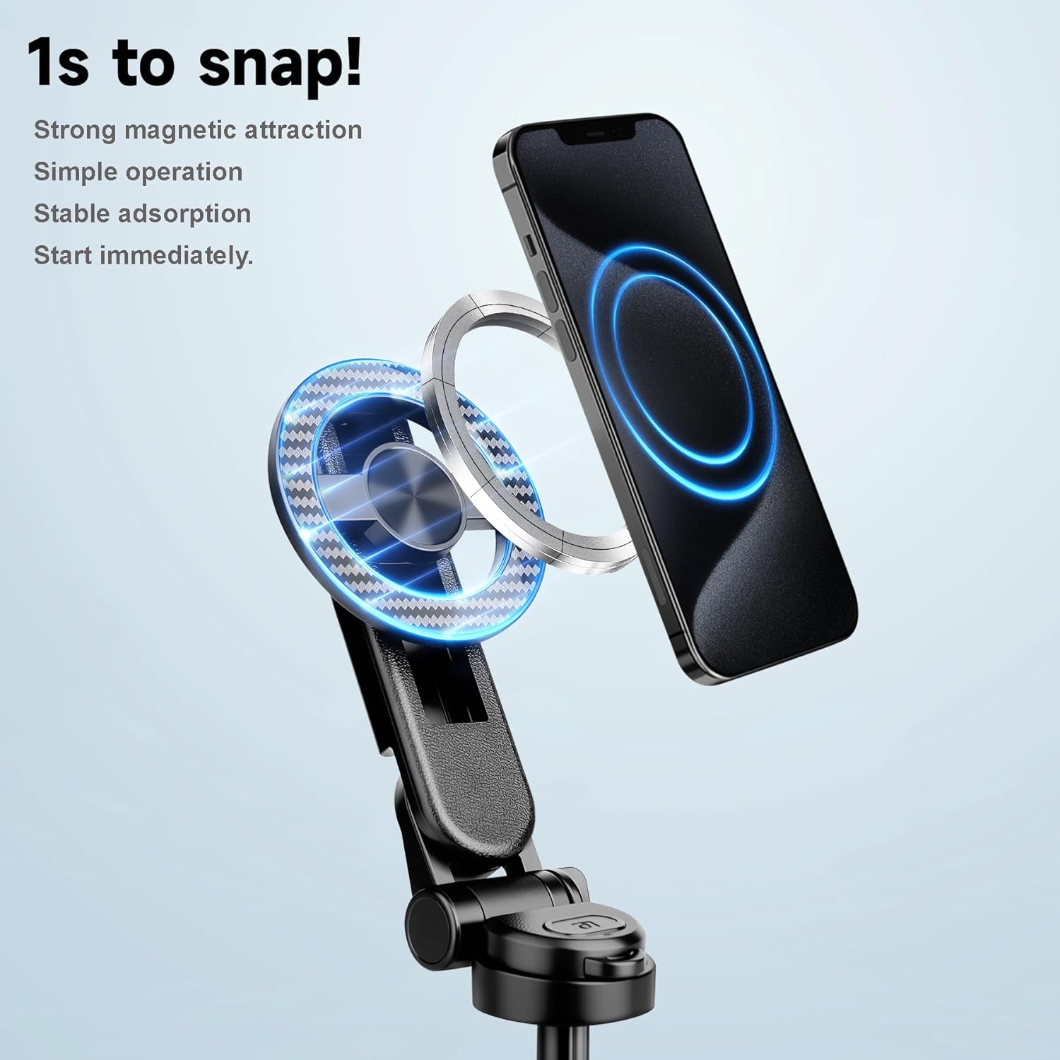 - 【Magnetic Suction & Instant Adsorption】This magnetic tripod provides an magnetic connection, no complicated assembly. Allowing you to quickly attach and detach your iPhone. Super strong suction ensure a secure attachment,making it perfect for capturing selfie moments without fumbling with clamps; Ideal for content creators and photographers seeking efficiency. The included magnetic ring can achieve better compatibility and firmness, compatible with iPhone/Android/Hongmeng OS.