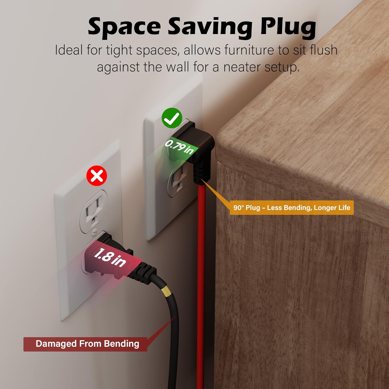 - Our Advantages: 90° low-profile right-angle plug saves space, perfect for tight or confined areas----Bright orange jacket provides high visibility for enhanced safety and helps prevent tripping accidents----Nickel-plated reinforced terminals resist bending and breaking, ensuring stable and durable performance----Tight and secure connection stays firm without loosening, remains cool after long-term use, ensuring electrical safety----Polarized plug design guarantees correct insertion direction, reducing the risk of short circuits----Available in multiple lengths from 15FT to 125FT, flexible and easy to store, meeting all indoor and outdoor usage needs