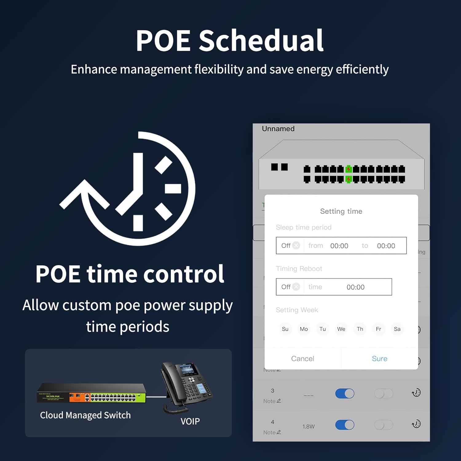 - 【VLAN Support & Power Secadual function】Every single port is visually manageable, providing granular control. Enjoy integrated VLAN functionality for enhanced network segmentation and security, plus the ability to schedule power delivery for each PoE port, optimizing energy usage.