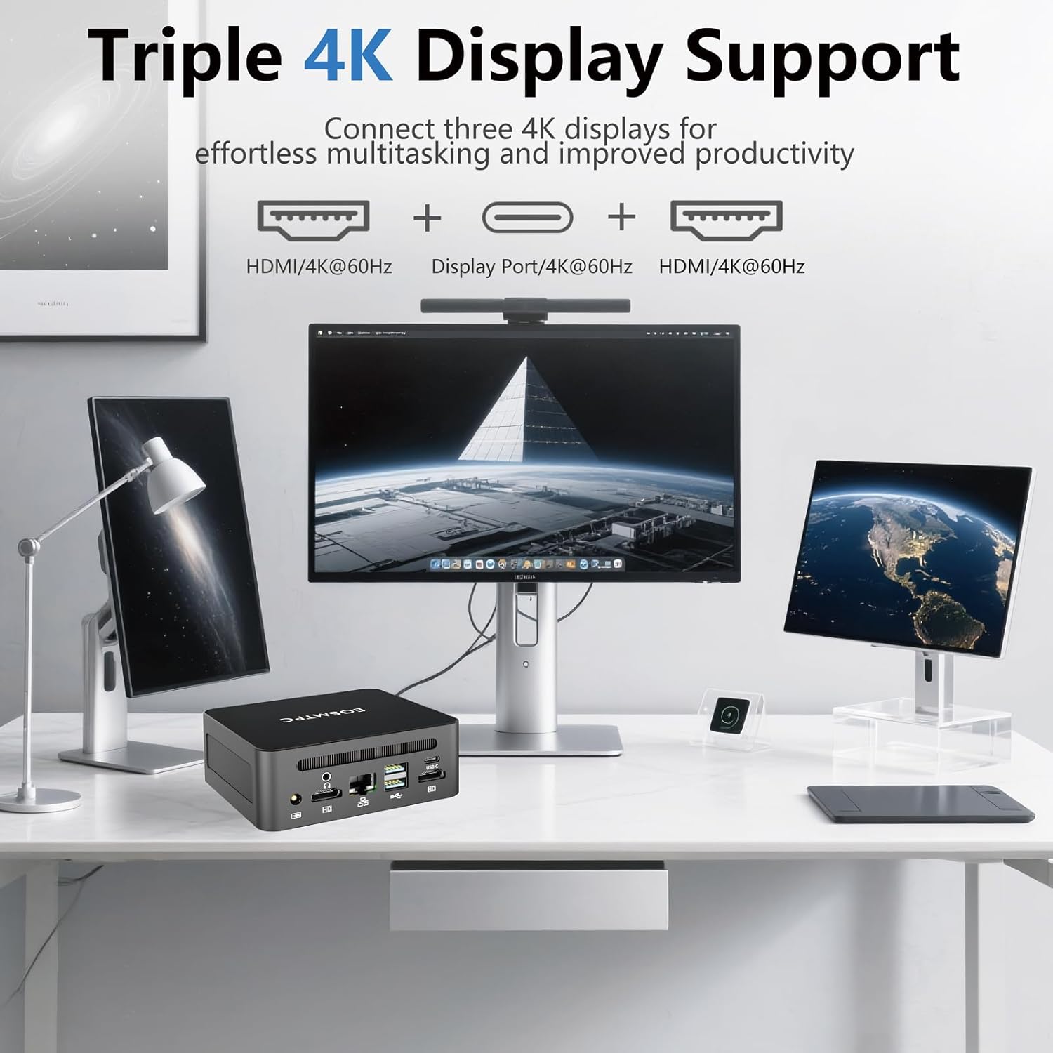 - ăCompact Design with Versatile ConnectivityăThe mini desktop computer comes with 2 x HDMI 2.0 (4K@60Hz), 3 x USB 3.2, 1 x USB 2.0, 1 x DC Port, 1 x Type-C (Power/Data), 1 x LAN Port, and 1 x Audio-in/out Jack port.The size of this small computer is only 4.5 x 4.2 x 1.7 inches, weighing just 2.65 lbs, making it easy to carry and organize on your desktop.Ideal for home offices, gaming, or media centers, this compact PC offers great performance in a space-saving design.