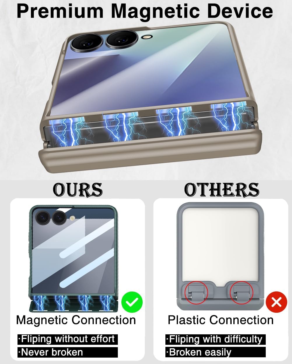 - [Advanced Hinge Protection]: Our Z Flip 7 case features an innovative hinge protection design specifically for the Galaxy Flip 7, providing complete protection from all angles. Our Z Flip 7 case is designed with a unique magnetic connection that won't be broken by impacts such as drops. Besides, our z Flip 7 case with unique design flips more smoothly without spring resistance.