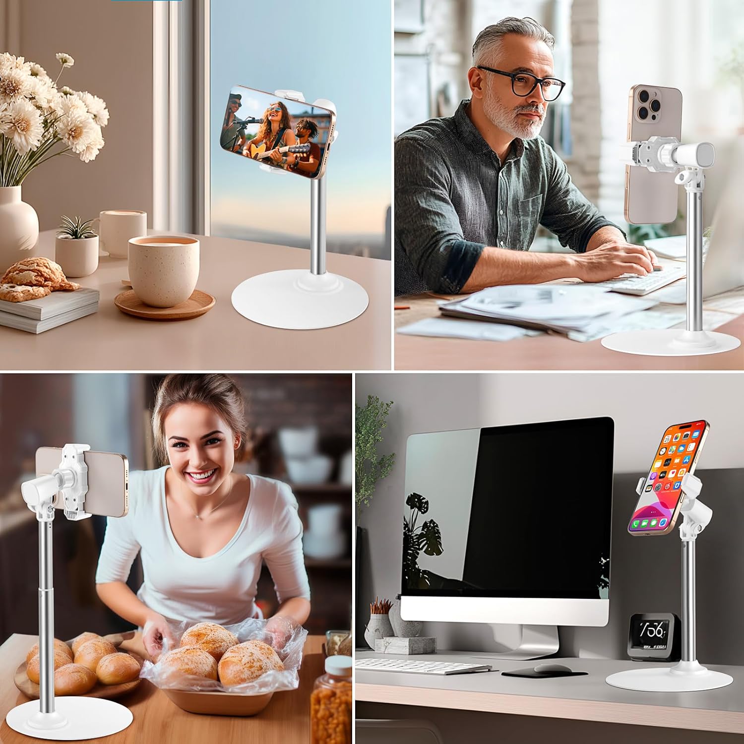 Adjustable Phone Stand for Desk with Clip Mount Live Streaming: 360° Rotatable Overhead Shot Holder with Sturdy Metal Base, Compatible with TikTok, YouTube, Zoom Video Recording (White)