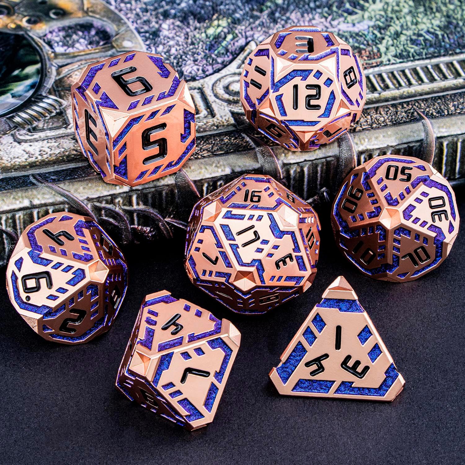 Metal DND Sci-fi Dice Set 7PCS Stripe Polyhedral Dice for Dungeons Dragons RPG Role Playing Game, Glitter D and D Dice with Gift Box D6 D8 D10 D12 D20 (Copper Blue)