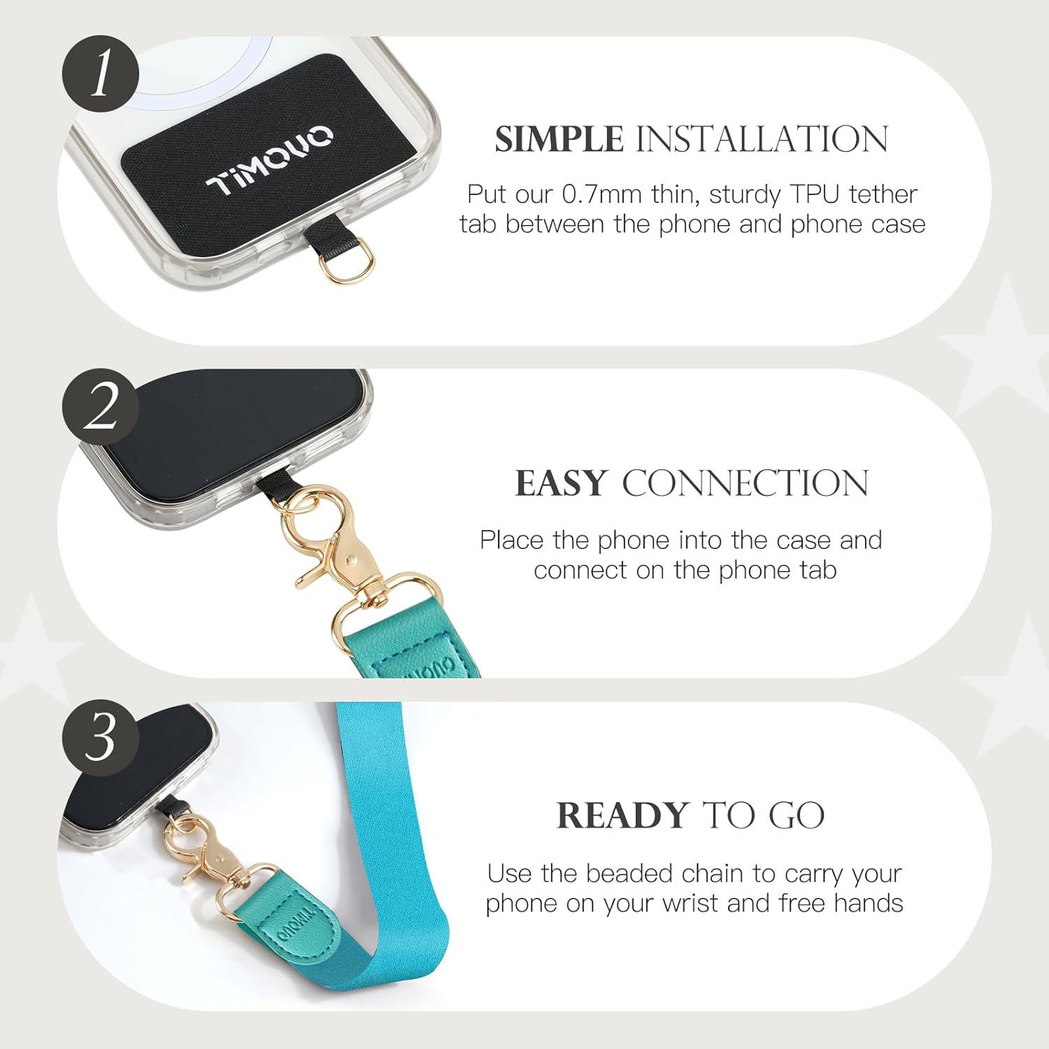 • What You Will Get: TiMOVO phone strap crossbody set includes 1 crossbody phone lanyard (total length: 150cm), 1 phone wrist strap (total length: 36cm), 2 key rings, and 2 strap patches. If you have any questions about this product, please let us know, and we are always here to help you.