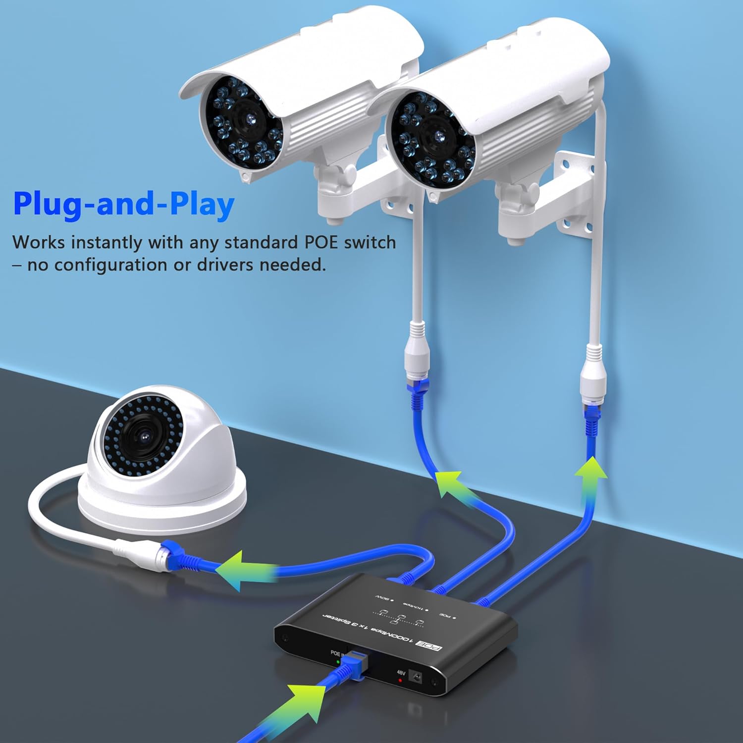 - 【3 Port Gigabit PoE Switch】Transform a single PoE switch port into three independent outputs with full Gigabit speed (10/100/1000Mbps). Delivers ≤30W per port to power IP cameras, wireless APs, and VoIP phones simultaneously – ideal for expanding networks without additional wiring or switch investments.
