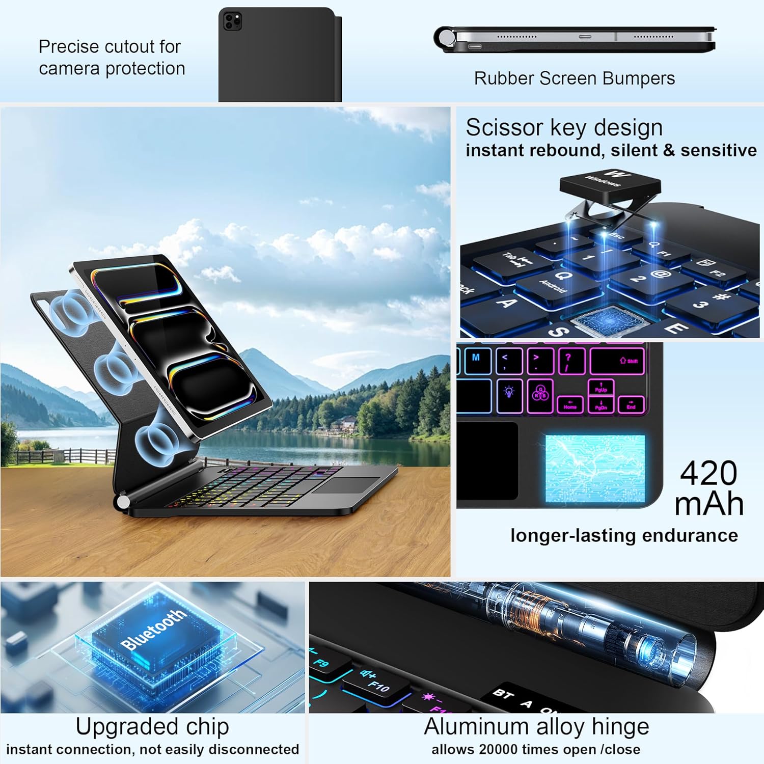 - 7-Color Backlit Keyboard Case for iPad Pro 13 M4๏ผFrom dawn to dusk, adapt effortlessly! Adjusting 7 backlight and 3 levels of brightness ensures clear visuals in every setting, enhancing your immersive experience.