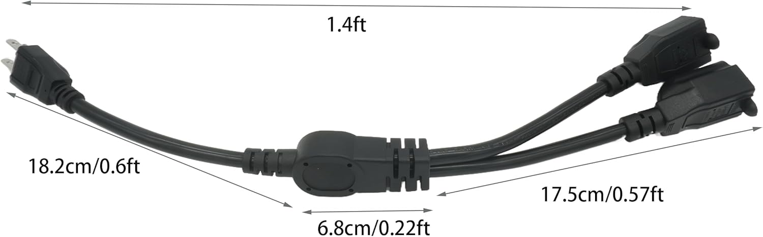 - High Quality 3 Prong Power Splitter Cord, the main cable and splitter cables are made of SJT 16 AWG. Connectors: NEMA 5-15P to NEMA 5-15R x 2, cable length: 1.4FT