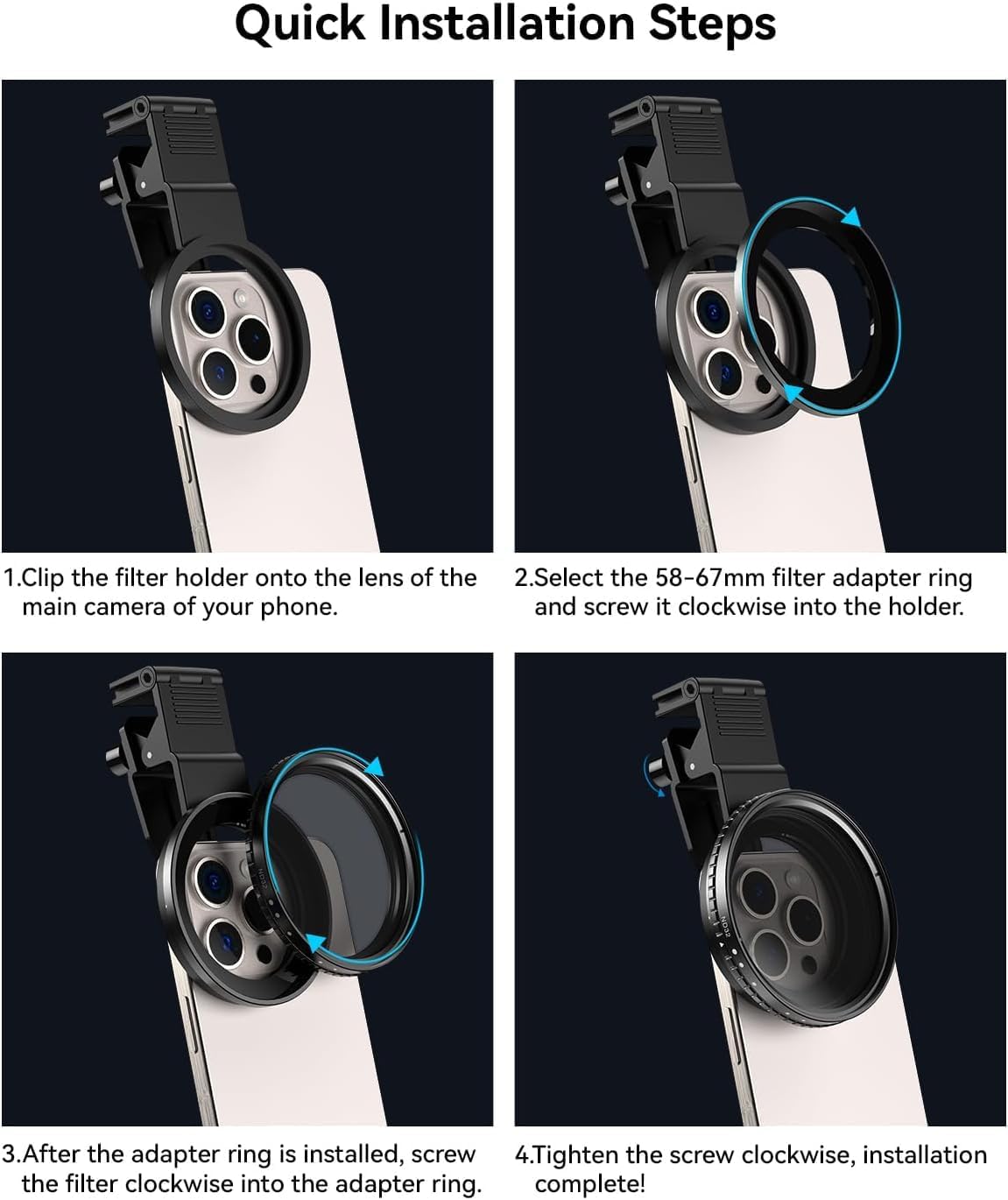 - Durable Aluminum Alloy Frame & Smooth Rotation: Our polarizing filter is made of durable aluminum alloy, providing a robust, long-lasting design. The filter features black anodized threads with precision CNC treatment for smooth, effortless rotation and easy setup. The clip’s hand-tighten knob and soft silicone pads securely attach the filter while protecting your device from scratches