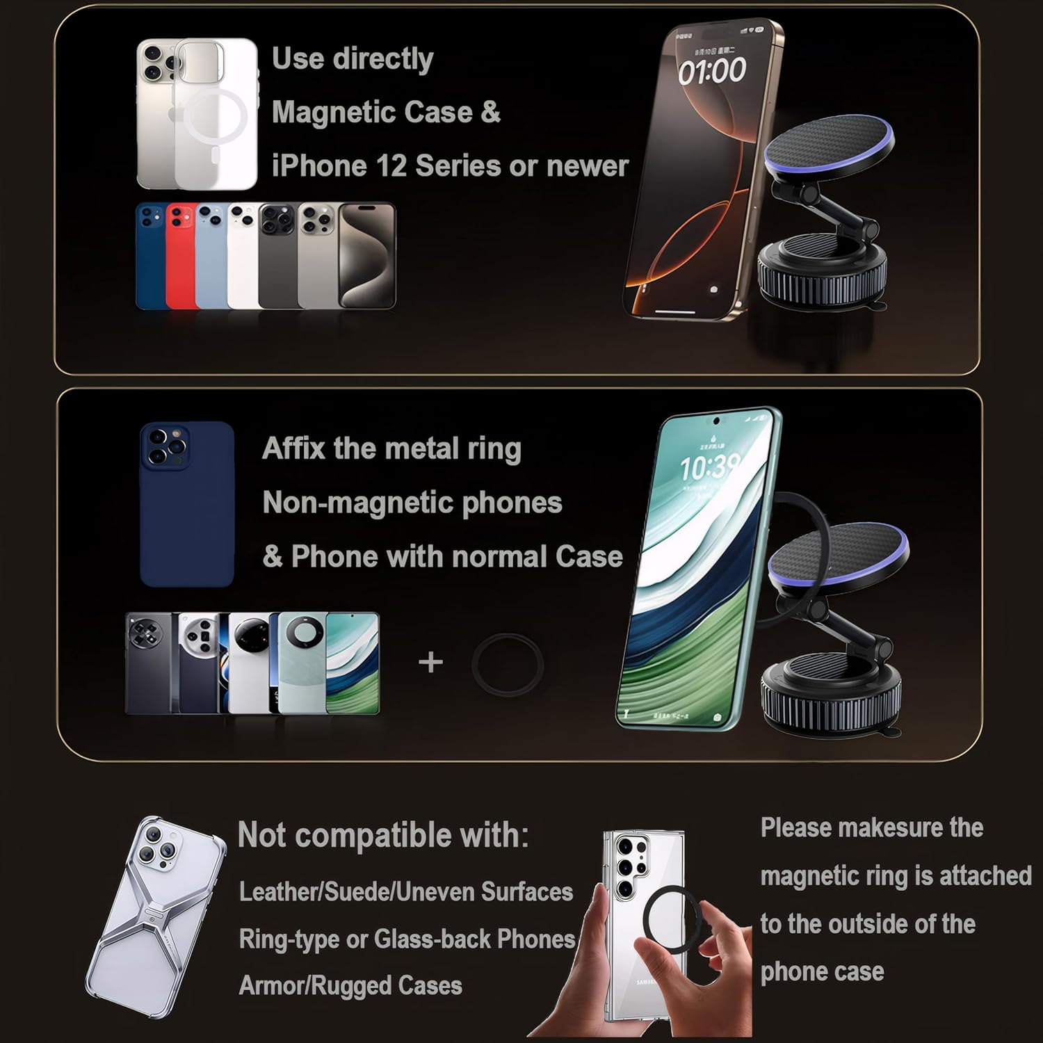 - 【Designed for Magsafe】The Raytrue-X Wireless Charging Mount for iphone uses official Tora-TC heat sink technology with its great quality and functionality, it is specially designed for iPhone 16/15/14/13/12 series and fits MagSafe cases. Includes a universal metal ring adapter for all Android devices, ensuring secure attachment even on bumpy roads, people in the car no need to worry about its falling off.