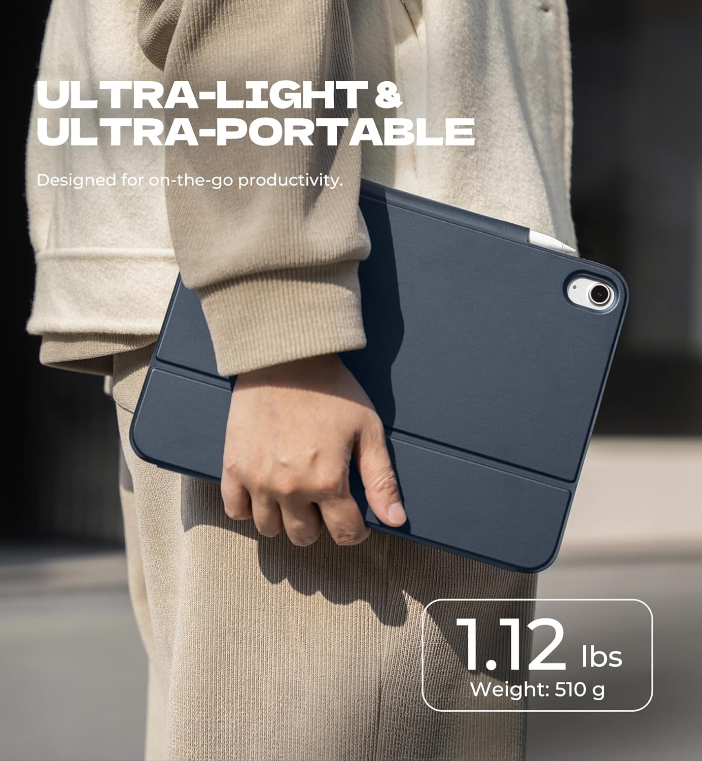 - [Ultra-light & Portable Design] Designed for on-the-go productivity, the ultra slim and thin keyboard case for iPad 11th/10th Generation combines powerful functionality with a travel-friendly design, weighing just 1.16 lbs. NOTE: It is NOT a Floating Cantilever Design and the iPad Screen WON'T be elevated. iPad sits right on the base on the keyboard.
