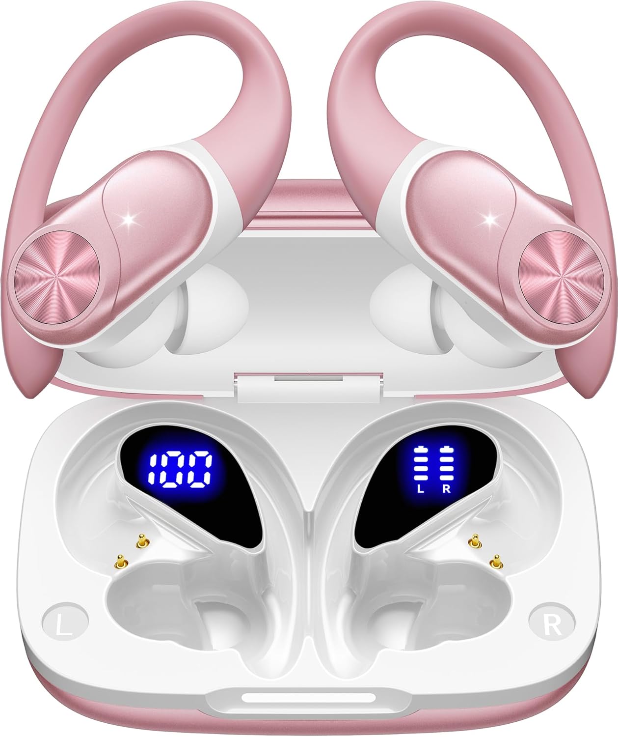 PocBuds Bluetooth Headphones Wireless Earbuds 80hrs Playtime Wireless Charging Case Digital Display Sport Ear Buds with Earhook Deep Bass IPX7 Waterproof Over-Ear Earphones for Phone Laptop Rose Gold