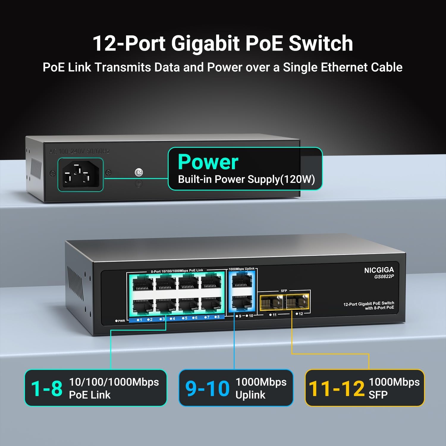 12 Port Gigabit PoE Switch Unmanaged with 8 Port IEEE802.3af/at PoE+@120W, 2 x 1000Mbps Uplink + 2 x 1G SFP, NICGIGA 8 Port Network Power Over Ethernet Switch, Desktop/Wall-Mount.