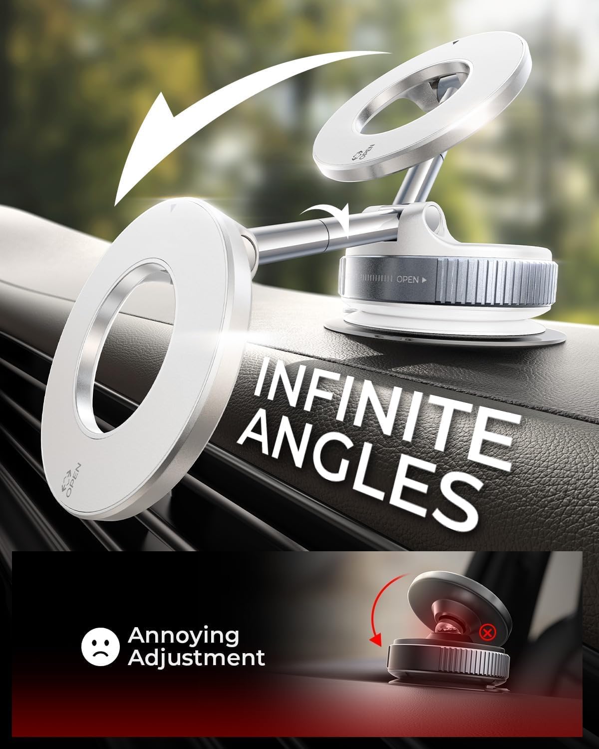 - [Strong Suction & Stable Hold on Any Road]: Engineered with advanced rotating-lock vacuum suction, this phone mount provides a 65% stronger suction than traditional press-on mounts. It remains stable on bumpy roads, during sudden stops, or sharp turns, ensuring your phone stays securely in place no matter the driving conditions