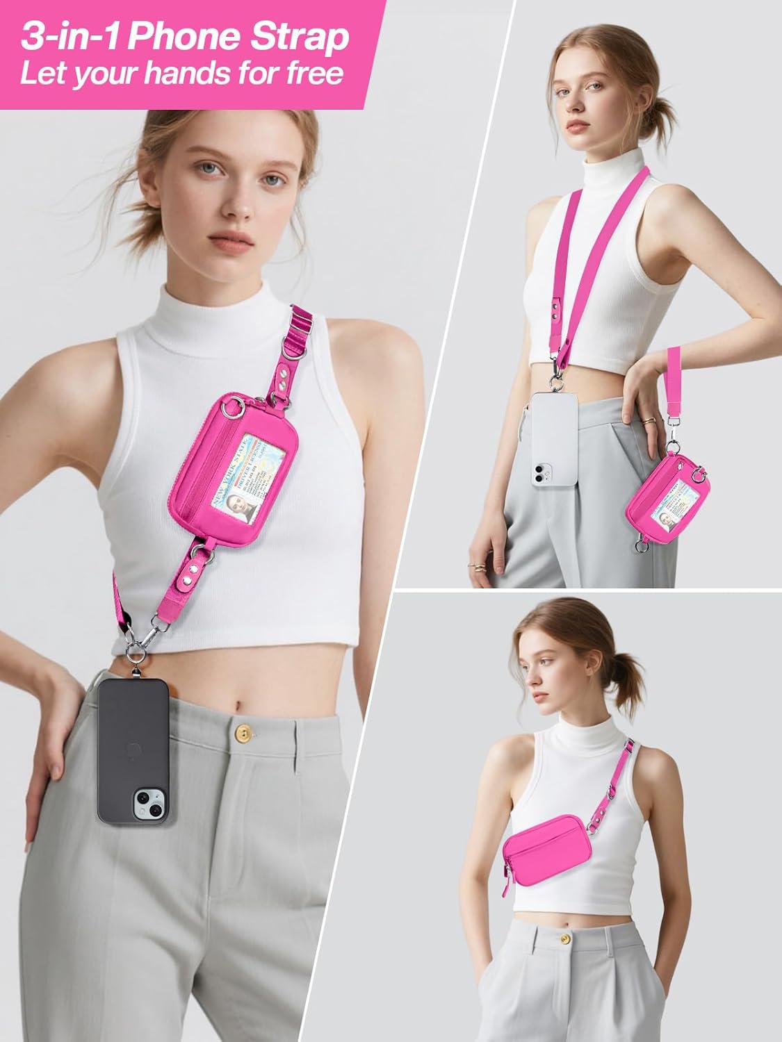 Clip and Go Strap for Phone with Wallet Crossbody Phone Lanyard Adjustable and Detachable RFID Wristlet Wallet with ID Window and Zipper, Hot Pink