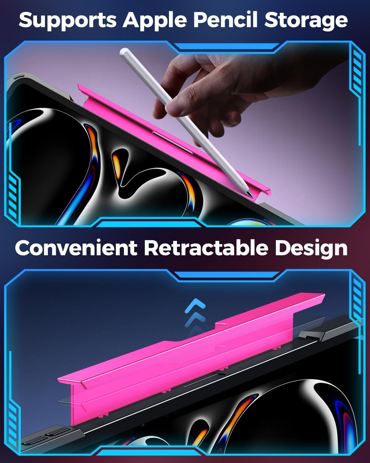 - 7-Color RGB Backlit Keyboard: Your iPad pro 11-inch 2024 m4/2025 m5 workflow with 7 colors and 3 brightness levels for effortless typing in any light. Enjoy quiet, responsive scissor-switch keys and convenient iPadOS shortcuts for enhanced productivity. The flexible magnetic pencil holder keeps your Apple Pencil secure