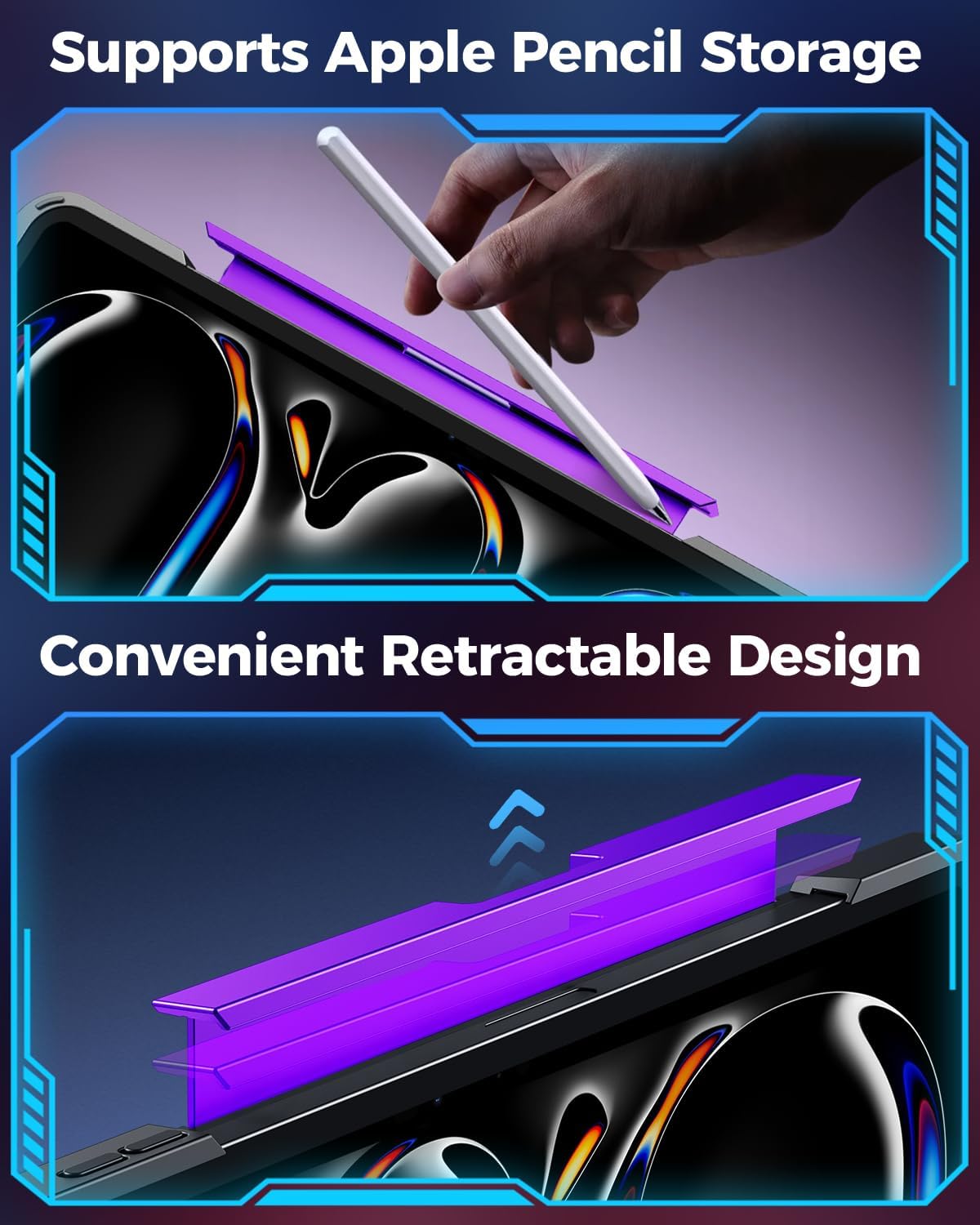 - 7-Color RGB Backlit Keyboard: Your iPad pro 11-inch 2025 m5/2024 m4 workflow with 7 colors and 3 brightness levels for effortless typing in any light. Enjoy quiet, responsive scissor-switch keys and convenient iPadOS shortcuts for enhanced productivity. The flexible magnetic pencil holder keeps your Apple Pencil secure