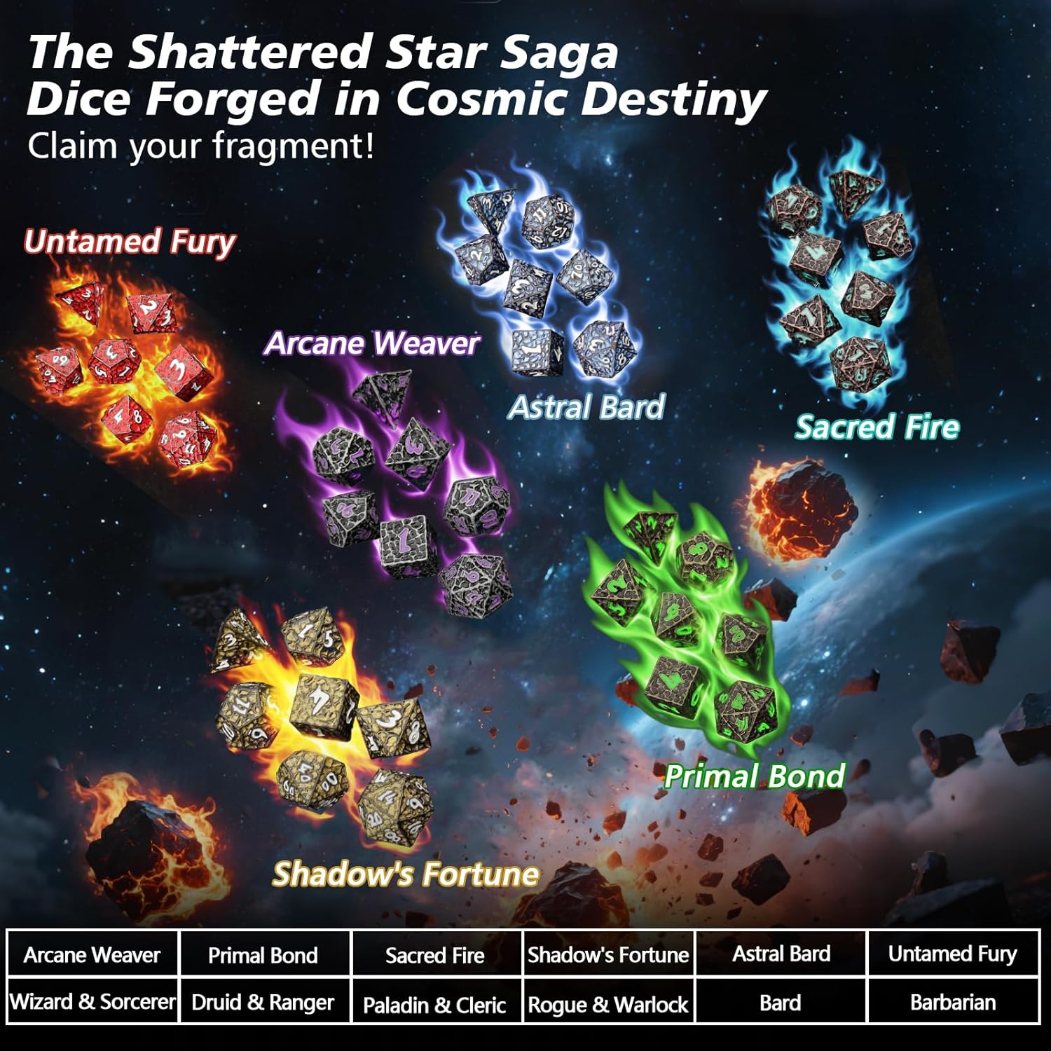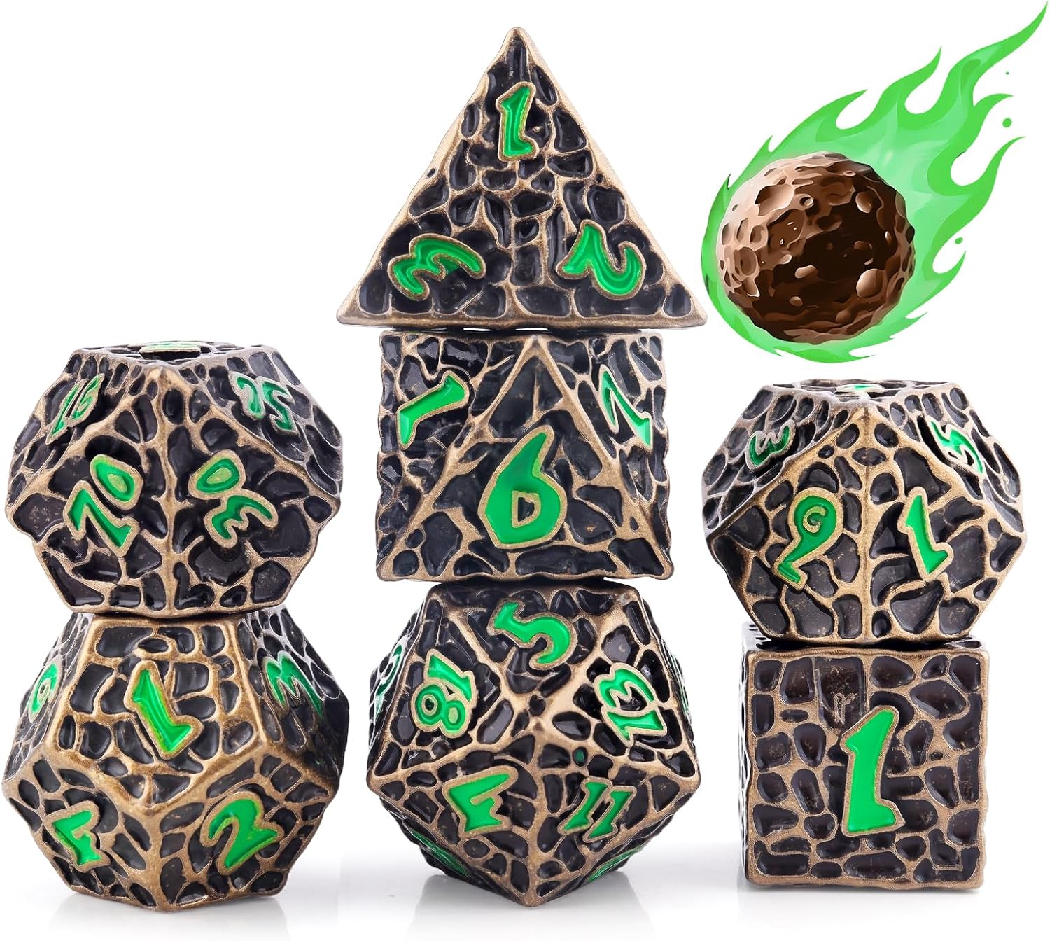 - Unique Meteorite-Inspired DND Dice: This green metal dice set is designed with a crack pattern inspired by meteor impacts and cosmic energy. Featuring realistic cracks and a bold meteorite finish, they bring a cool, sci-fi vibe to your DND games