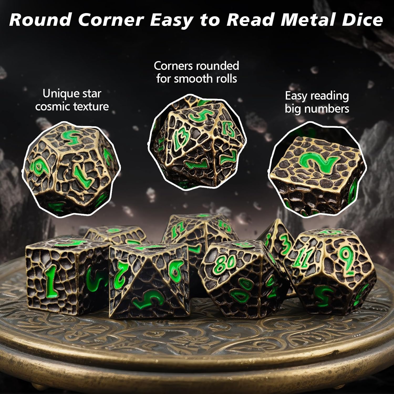 - Big Easy to Read Numbers: With easy-to-read, specially marked numbers, these unique copper green metal d&d dice are sure to catch attention. Whether you're a player or DM, these dnd dice won’t just roll — they’ll speak for you and captivate everyone around the table