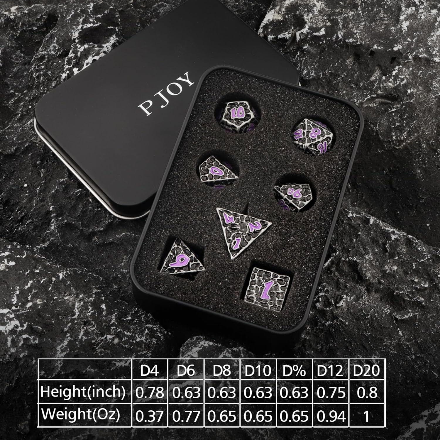 PJOY Metal Dice Set D&D for Dungeons and Dragons Dice with Case Meteorite Iron Purple 7PCS 16mm Role Playing Cool DND Gifts for Players DM Board Game Masters Wizards
