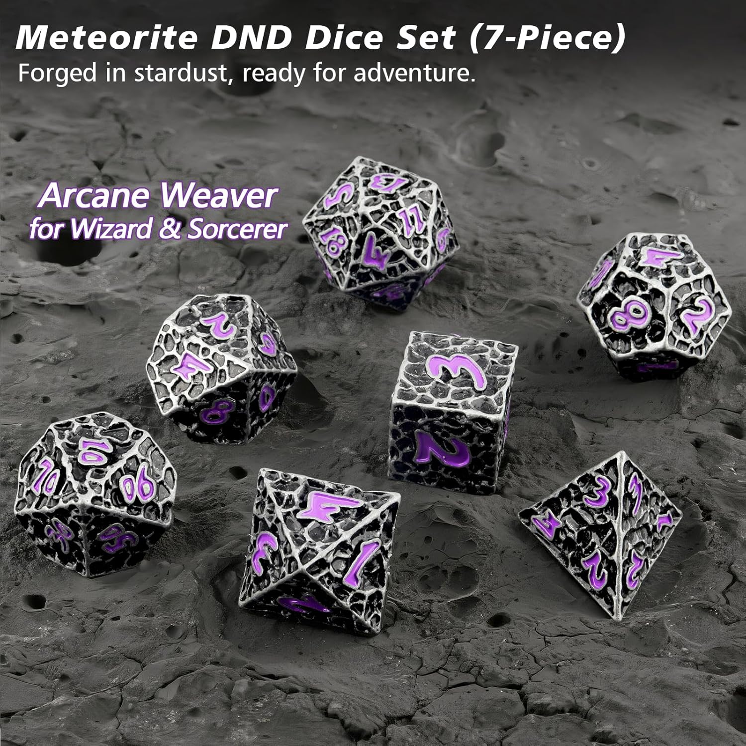 - Meteorite Theme with Unique Crack Design: This metal DND dice set features a cracked meteorite design, inspired by cosmic energy and meteor impacts. Realistic cracks and a bold meteorite look give your game a cool, sci-fi touch