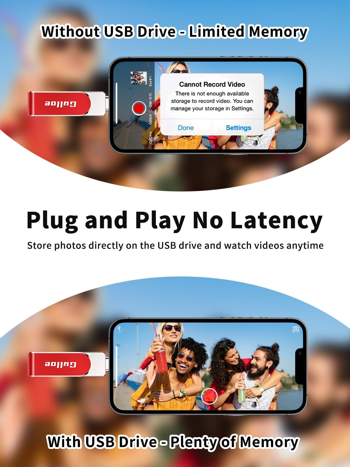 - 【Watch Movies, Photos and Play Music Directly From Phone Flash Drive】Store your favorite videos, audios and music on your iPhone's Photo Stick, then seamlessly plug and play on your iPhone or iPad anytime, anywhere. No more need for Internet or WiFi. This iPhone storage device plays videos in many different formats. Pictures stored on the Phone storage device also support different formats. Great way to store all your pictures and videos on an phone external storage device.
