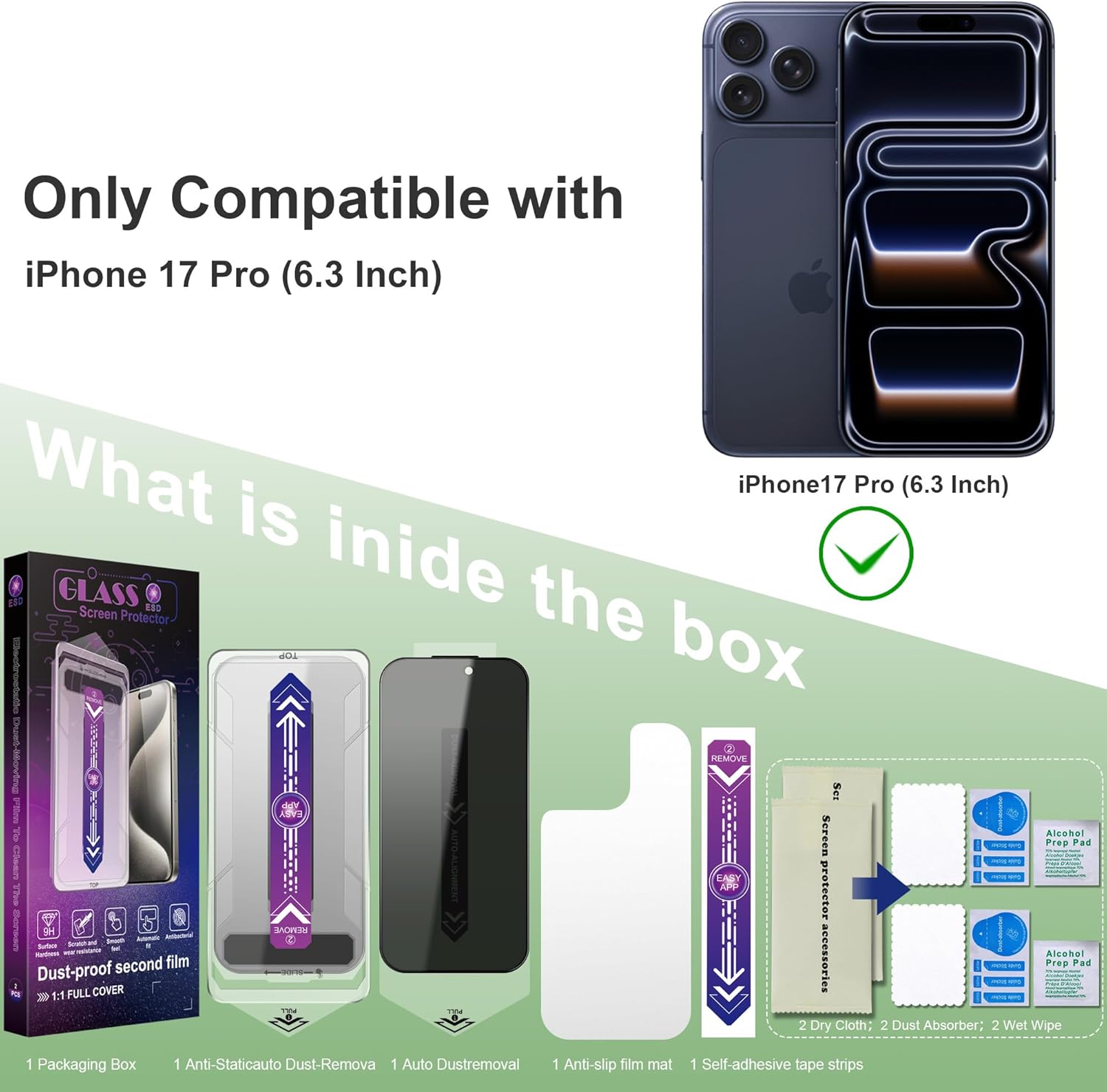 Privacy Screen Protector for iPhone 17 Pro 6.3-Inch, Auto Dust Removal, 9H Tempered Glass, Full Cover, Anti-Fingerprint, Easy Installation,2 Pack