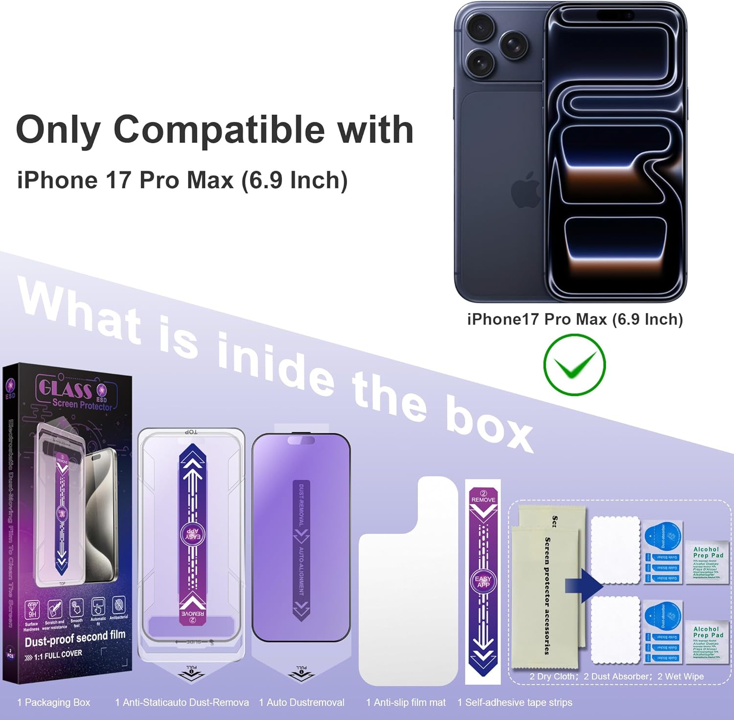 - Automattc Dust Removal Technology:Simply close and pull iPhone 17 Pro Max screen protector will automatically align and Watch our installation video to see how easy it is to install a screen protector with our film and the second pack installation video