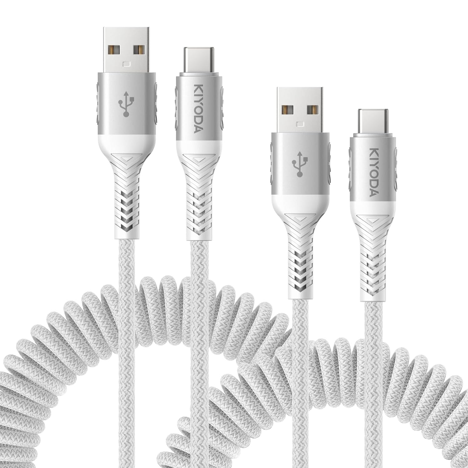 Coiled USB to USB C Cable for Car 3FT/6FT, USBC Cables Fast Charging Braided USB-A to USB-C Phone Charger Cord USB Type C Cable for iPhone 17 16 15 Pro Max, Samsung Galaxy S24 S23-2Pack Silver