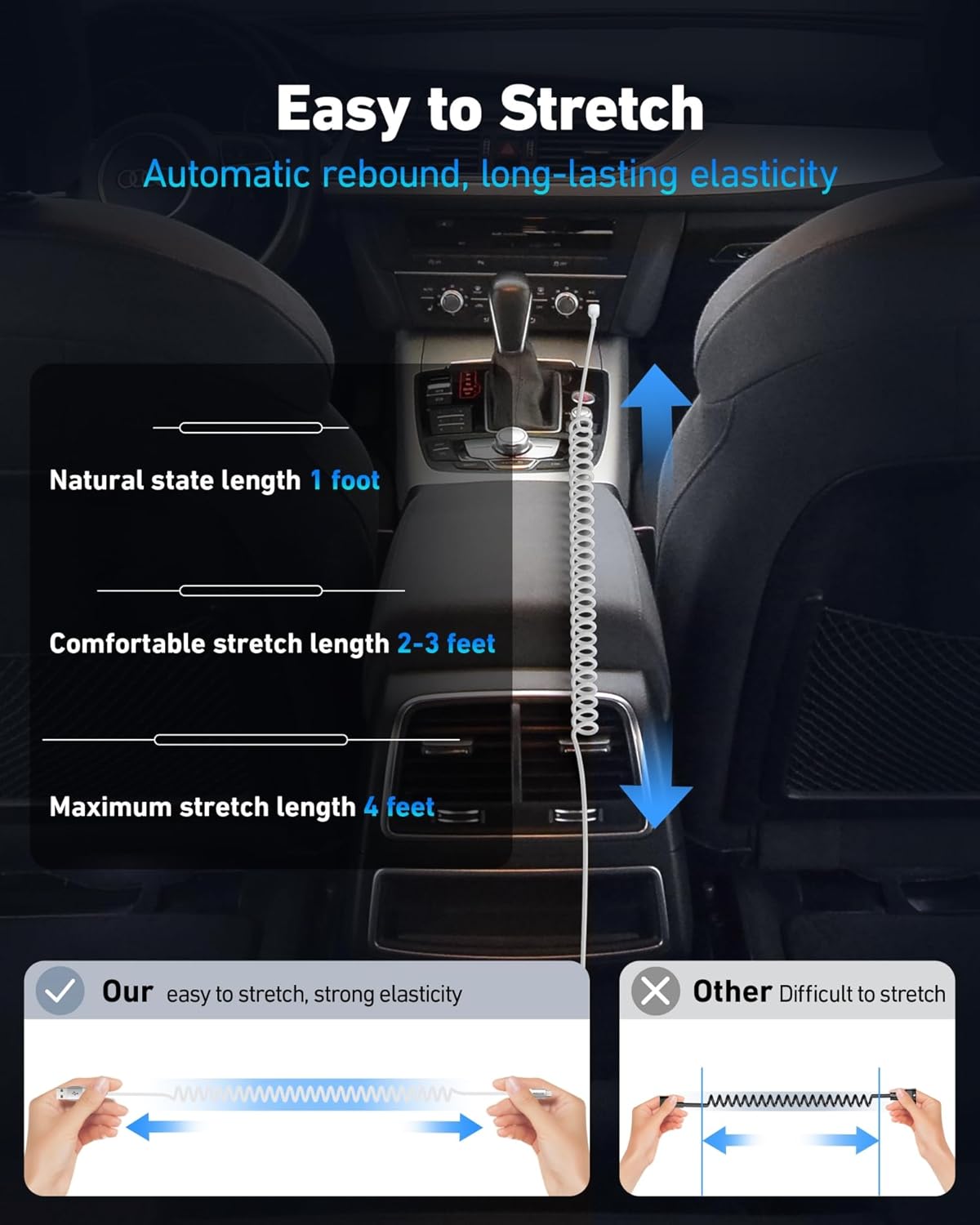 - Stretchable Length and High Flexibility: The natural length is 1 foot, the maximum stretch length is 4 feet, and the comfortable use length is stretched to 2-3 feet; The natural length is 2 foot, the maximum stretch length is 6 feet, and the comfortable use length is stretched to 3-5 feetautomatically rebounding to the natural state when not in use. The braided cable is made of high-quality nylon, which has better flexibility, wear resistance, easy stretching, fast rebound, and long-lasting elasticity.