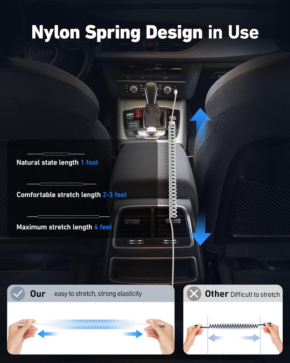 - Stretchable Length and High Flexibility: The natural length is 1 foot, the maximum stretch length is 6 feet, and the comfortable use length is stretched to 2-5 feet, automatically rebounding to the natural state when not in use. The braided cable is made of high-quality nylon, which has better flexibility, wear resistance, easy stretching, fast rebound, and long-lasting elasticity.