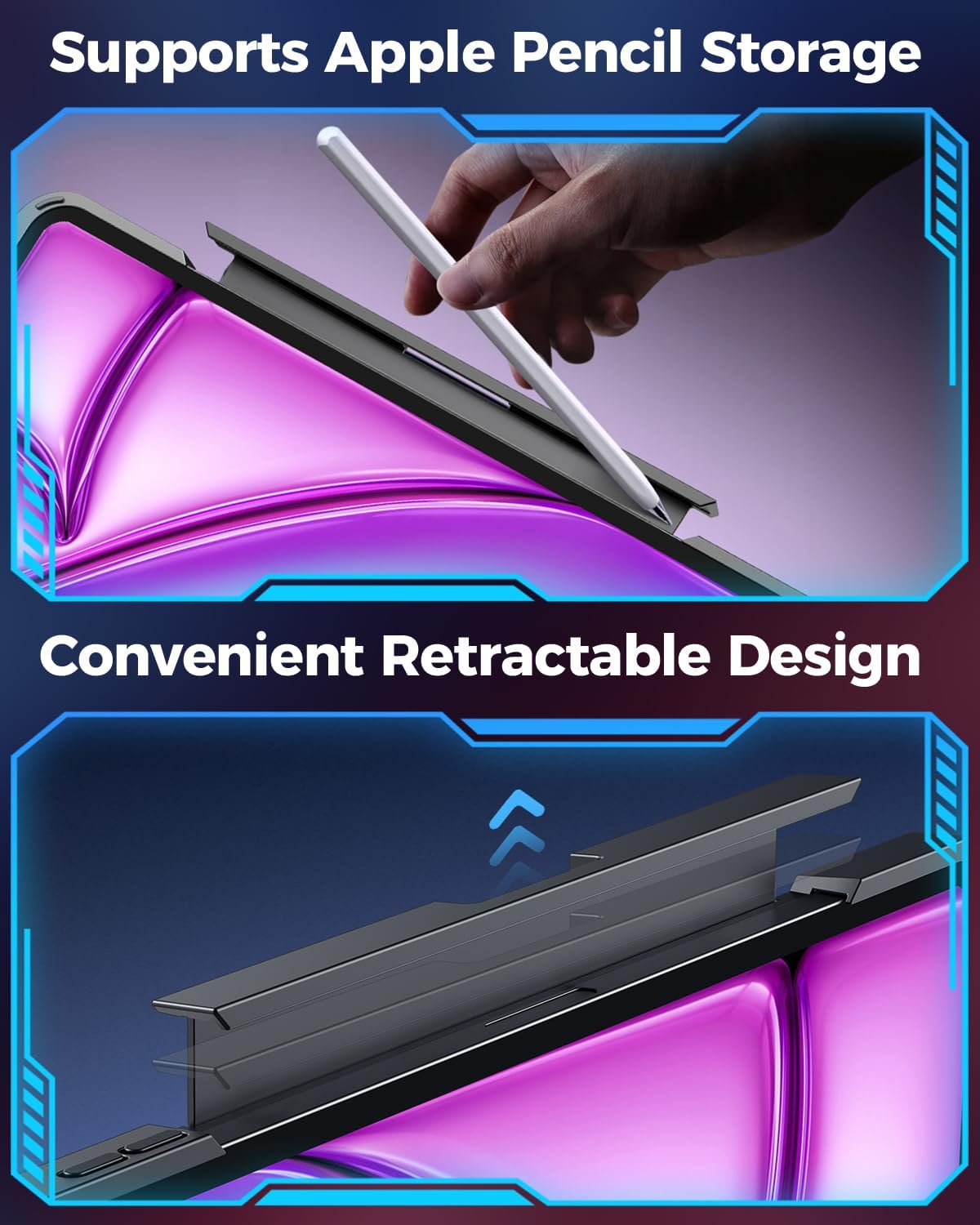 - 7-Color RGB Backlit Keyboard: Your iPad air 13-inch M2/M3 workflow with 7 colors and 3 brightness levels for effortless typing in any light. Enjoy quiet, responsive scissor-switch keys and convenient iPadOS shortcuts for enhanced productivity. The flexible magnetic pencil holder keeps your Apple Pencil secure