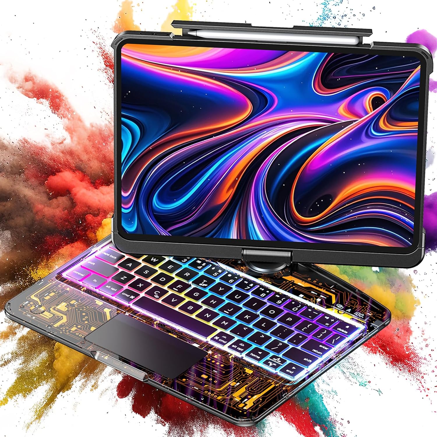 - 7-Color RGB Backlit Keyboard: Your iPad pro 13-inch 2024 m4/2025 M5 workflow with 7 colors and 3 brightness levels for effortless typing in any light. Enjoy quiet, responsive scissor-switch keys and convenient iPadOS shortcuts for enhanced productivity. The flexible magnetic pencil holder keeps your Apple Pencil secure