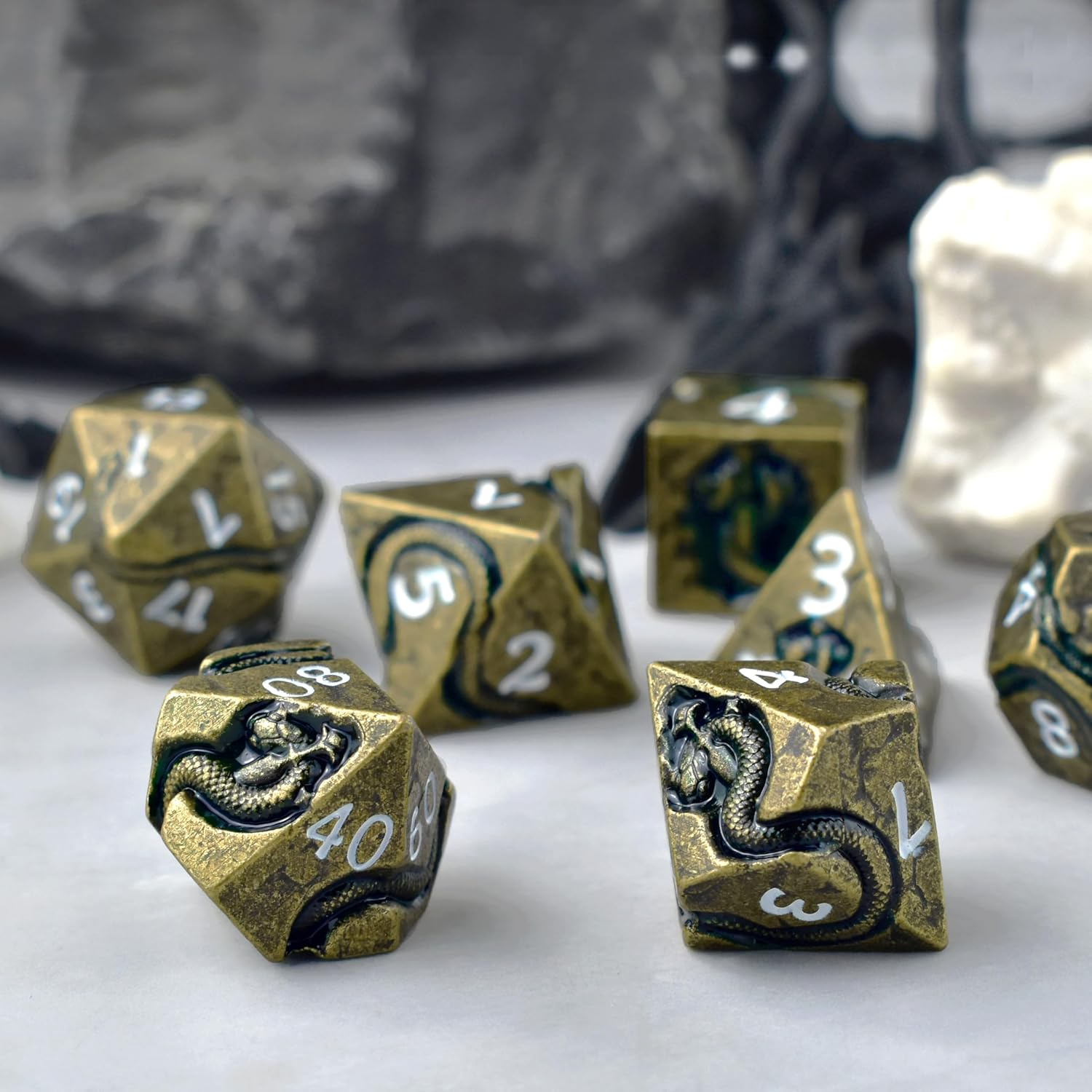 RULE DICE Metal D&D Dice, DND Dice Set, Polyhedral Dice for Dungeons and Dragons RPG Games | 7pc D and D Dice Set with Green Serpent | Gift for TTRPG Players
