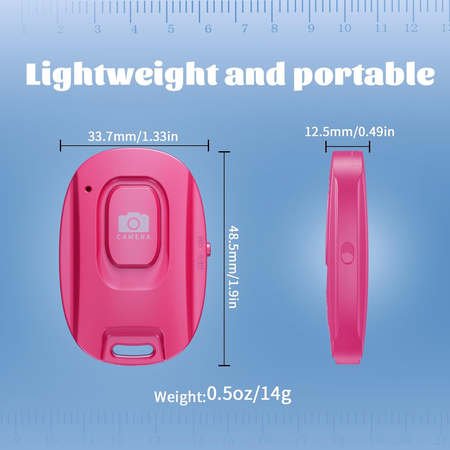 - [Compact & Portable Design]Our Bluetooth Remote Camera Control is compact and lightweight, making it a breeze to carry wherever you go. With dimensions of 48.5mm x 33.7mm x 12.5mm,the versatile size makes it effortless to store and carry, whether it's in your pocket or on your keychain.Keep it close at hand and immerse yourself in a world of boundless creativity.