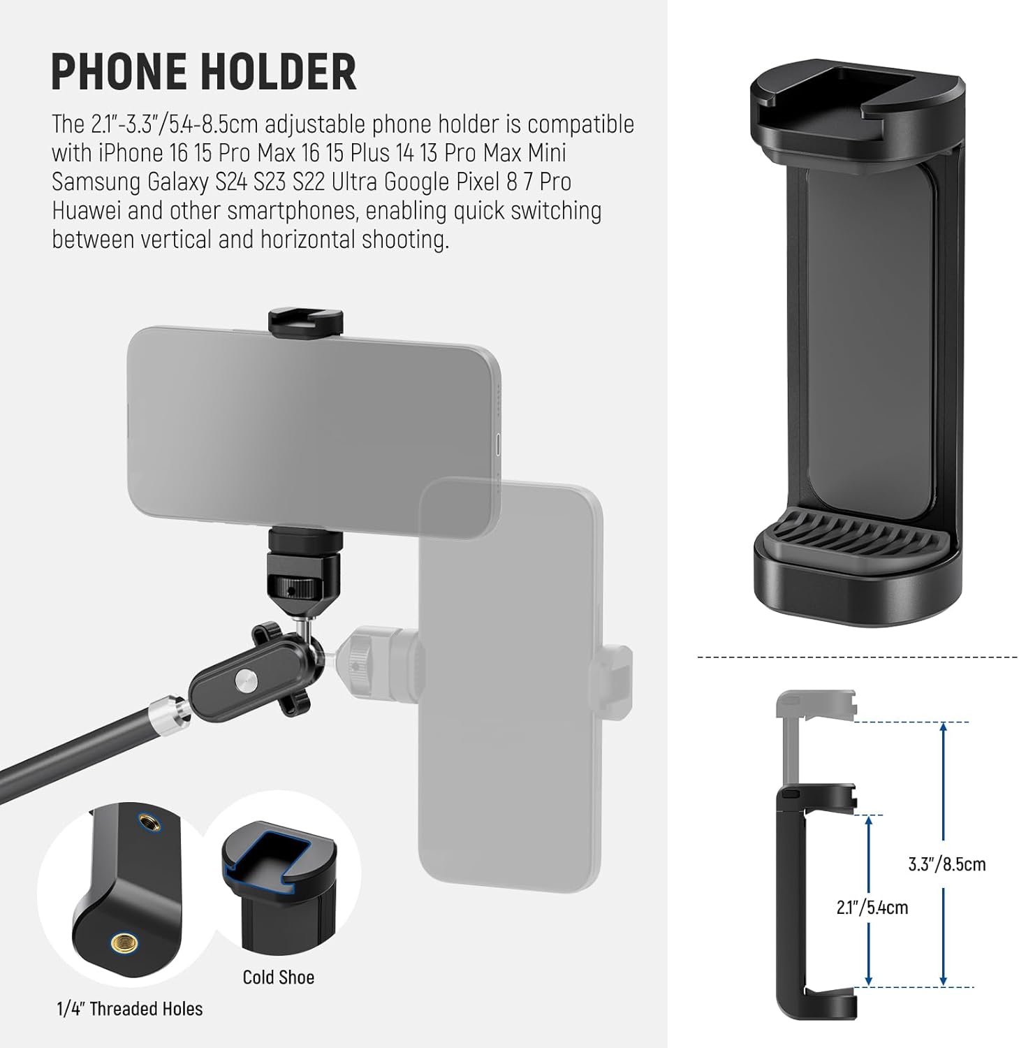 - 【Universal Phone Holder】 The 2.1"-3.3"/5.4-8.5cm adjustable clip phone holder is compatible with iPhone 16 15 Pro Max 15 Plus 14 13 Pro Max Mini Samsung Galaxy S24 S23 S22 Ultra Google Pixel 8 7 Pro Huawei and other smartphones, enabling quick switching between vertical filming and horizontal shooting. The overhead phone mount also features 1/4" screw holes and a cold shoe mount to attach microphones, lights, or other accessories to enhance your setup