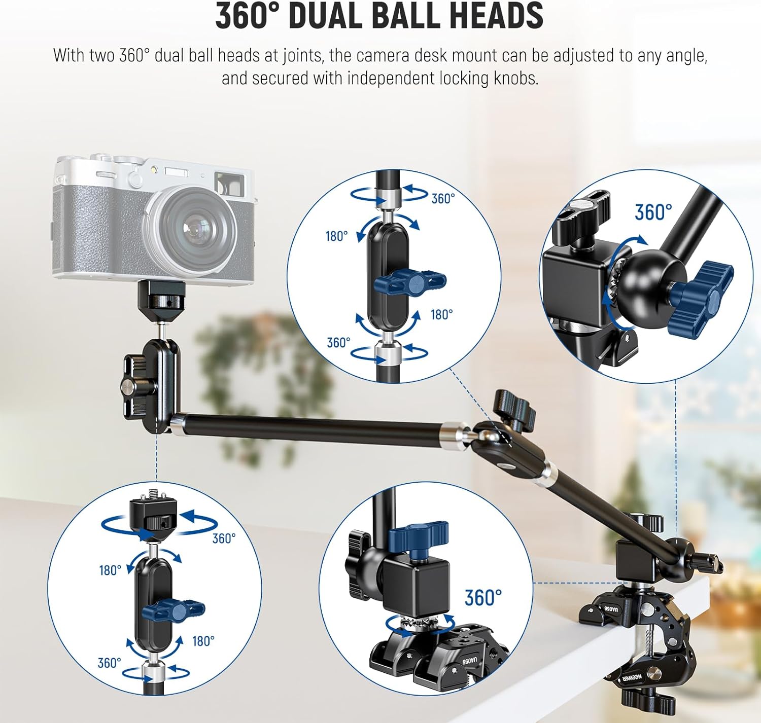 - 【360° Dual Ball Heads & 30"/75cm Extended Reach】 With a 30"/75cm two section articulating arm and 360° dual ball heads, this camera desk mount allows flexible adjustment with independent locking knobs, ideal desktop rig accessories as table low profile boom arm stand for microphone (mic) podcast, for YouTube TikTok video recording, overhead vlogging, gaming streaming, Zoom calls conferencing, etc. Note: The super clamp and magic arm are permanently attached and cannot be used separately