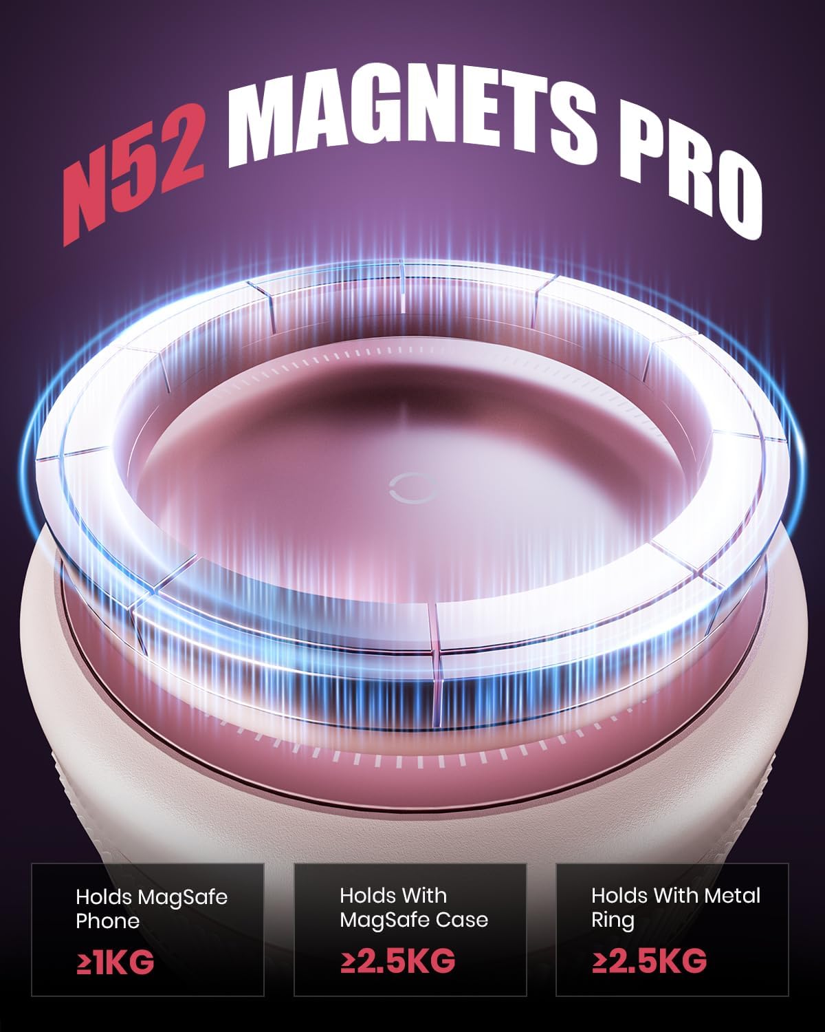 - 【Strengthened Grip, Steady Hold】The vacuum magnetic phone holder uses N52 magnets with 2800GF pull force and strong suction to lock your phone tightly in place. It stays secure even on bumps, sharp turns, and sudden stops. Mount it on smooth surfaces, or use the round base for textured surfaces.