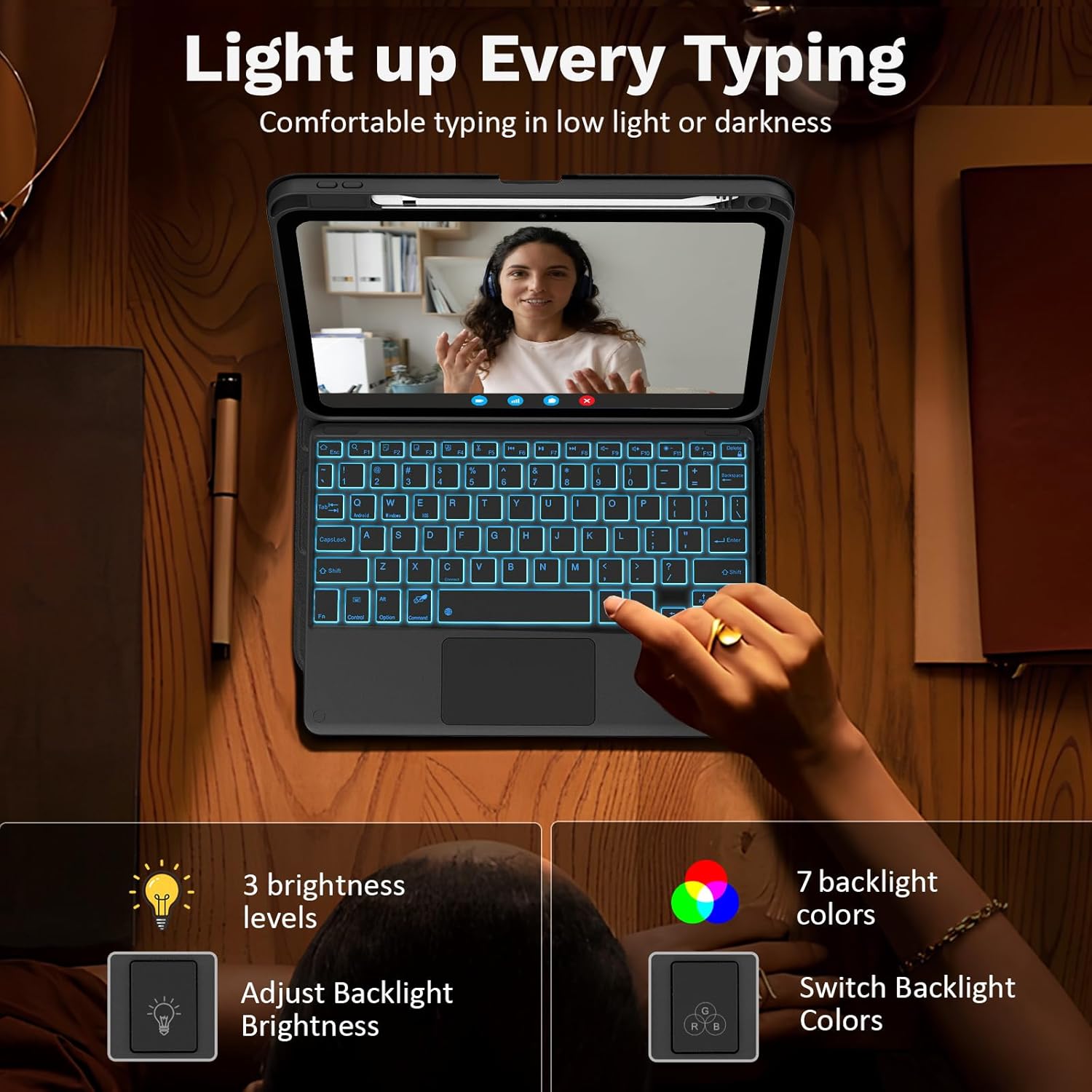 - 7-Color Backlit & Precise Multi-touch Trackpad: Our iPad 11th generation keyboard case features a 7-color backlit design and equipped with a built-in trackpad. 3 adjustable brightness levels and adjustable 7 RGB pure backlit allow you enjoy illuminated typing experience, type at day and night. Multi-touch trackpad on the iPad 10th Generation keyboard provides precise responses for editing, browsing, and videos; Transform your iPad (A16) 11th generation tablet 2025 into a laptop-like device