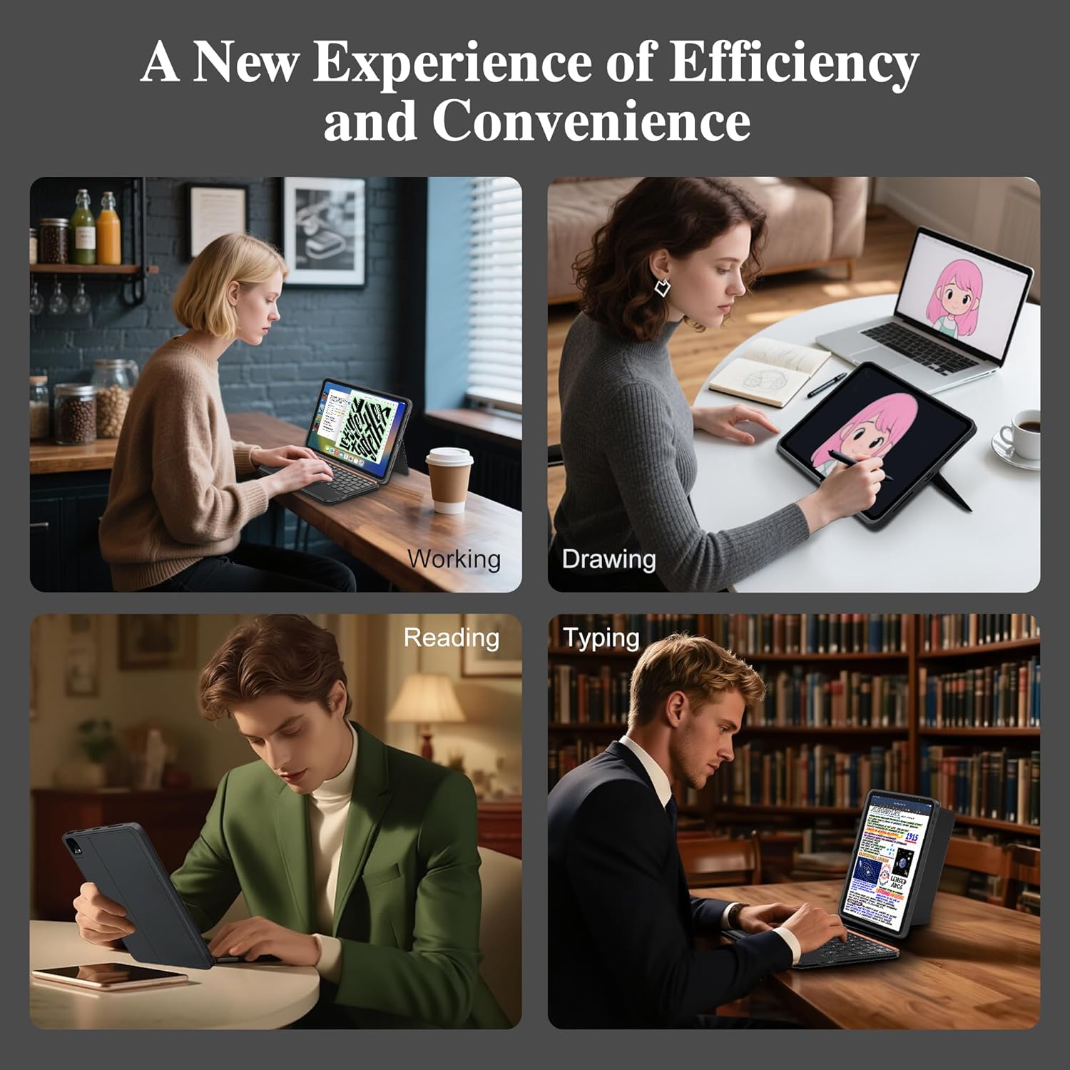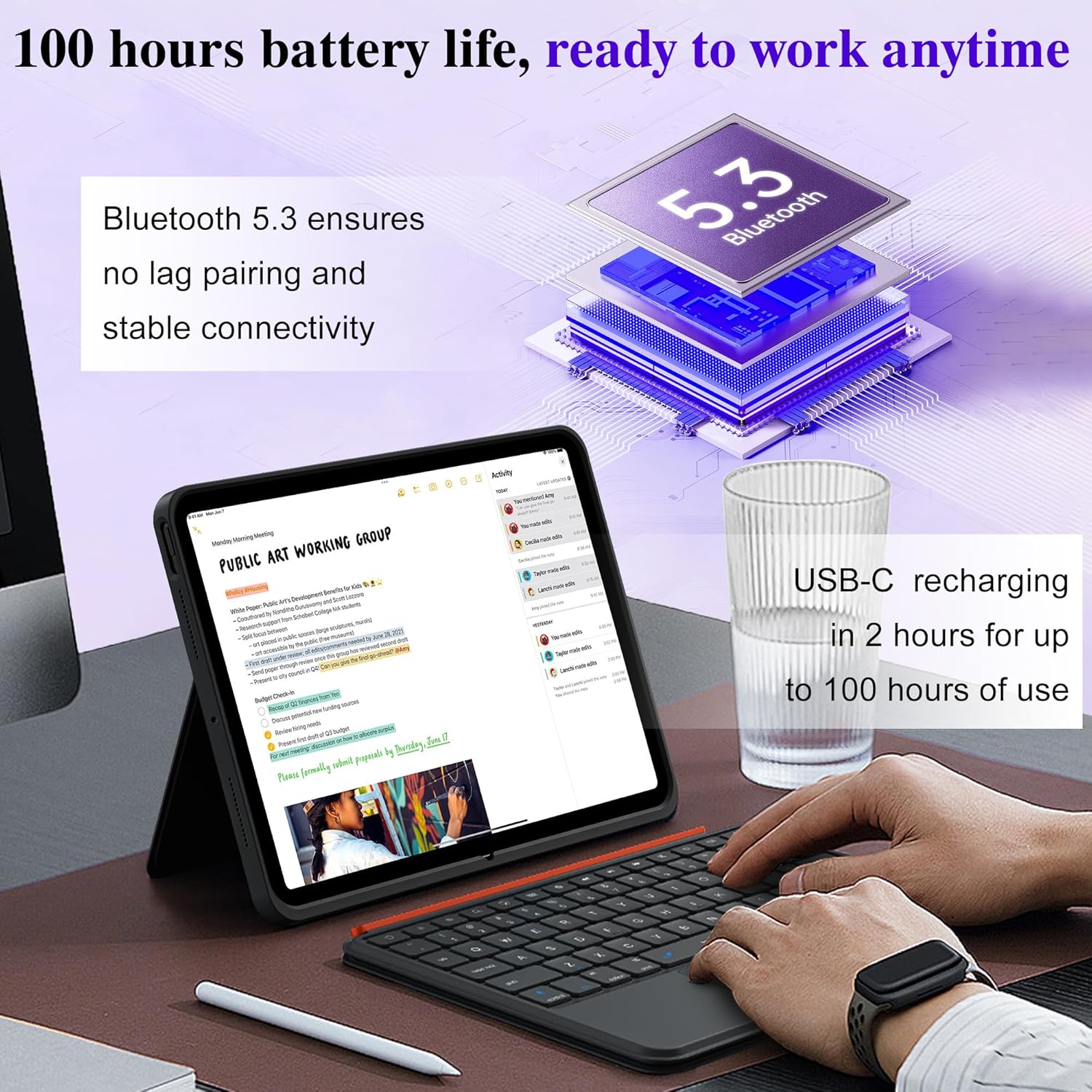 - Slim Design & Bluetooth No Lag:iPad keyboard 0.25 inch ultra-thin design.The foldable stand adjusts from 0°to 170°,fill needs for different angles.Bluetooth 5.3 ensures instant,no lag pairing and stable connectivity.Easily switch to work mode during commutes or in cafes