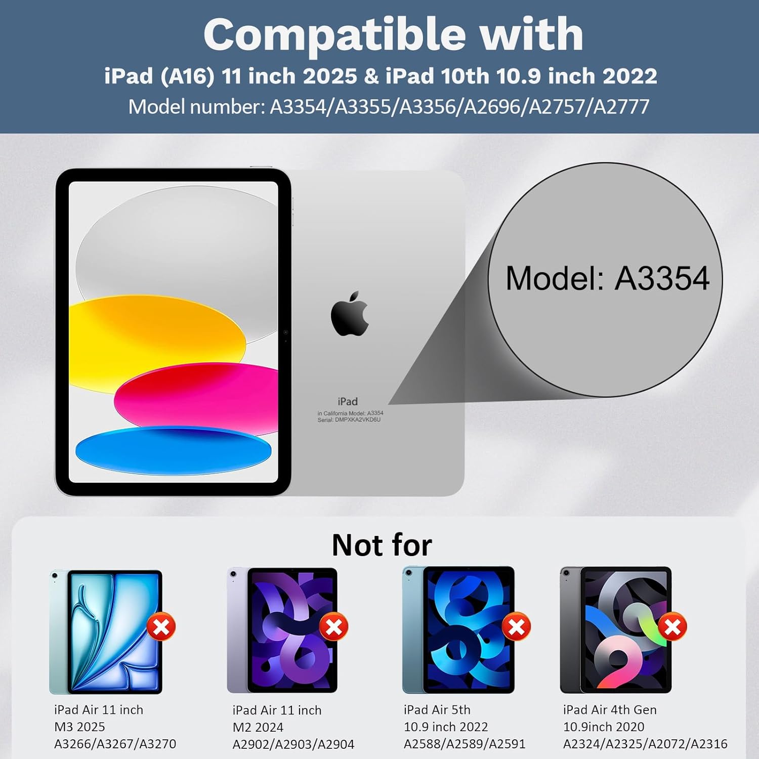 - Compatibility: SPECIALLY and ONLY designed for iPad (A16) 11th generation 11-inch 2025 (Model: A3354, A3355, A3356), iPad 10th generation 10.9-inch 2022 (Model: A2696, A2757, A2777). Including 1 x iPad 11th/10th generation case, 1 x wireless 7-color backlit touchpad keyboard, 1x USB-C charging cord, 1 x user guide. NOT compatible with any other iPad models