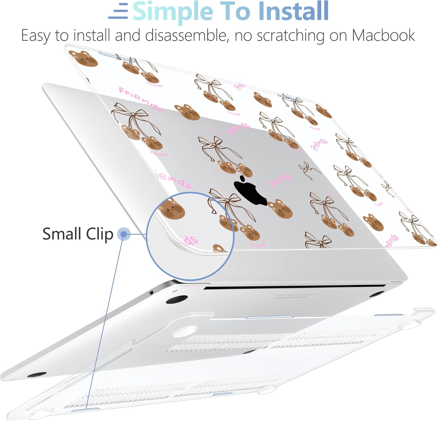 - Design Features of Case: The bottom case is designed with vents for maximum heat dissipation. The bottom case has non-slip feet to avoid slipping during use. The precise cutting design allows you to access all the ports of your MacBook. It is easy to install and remove