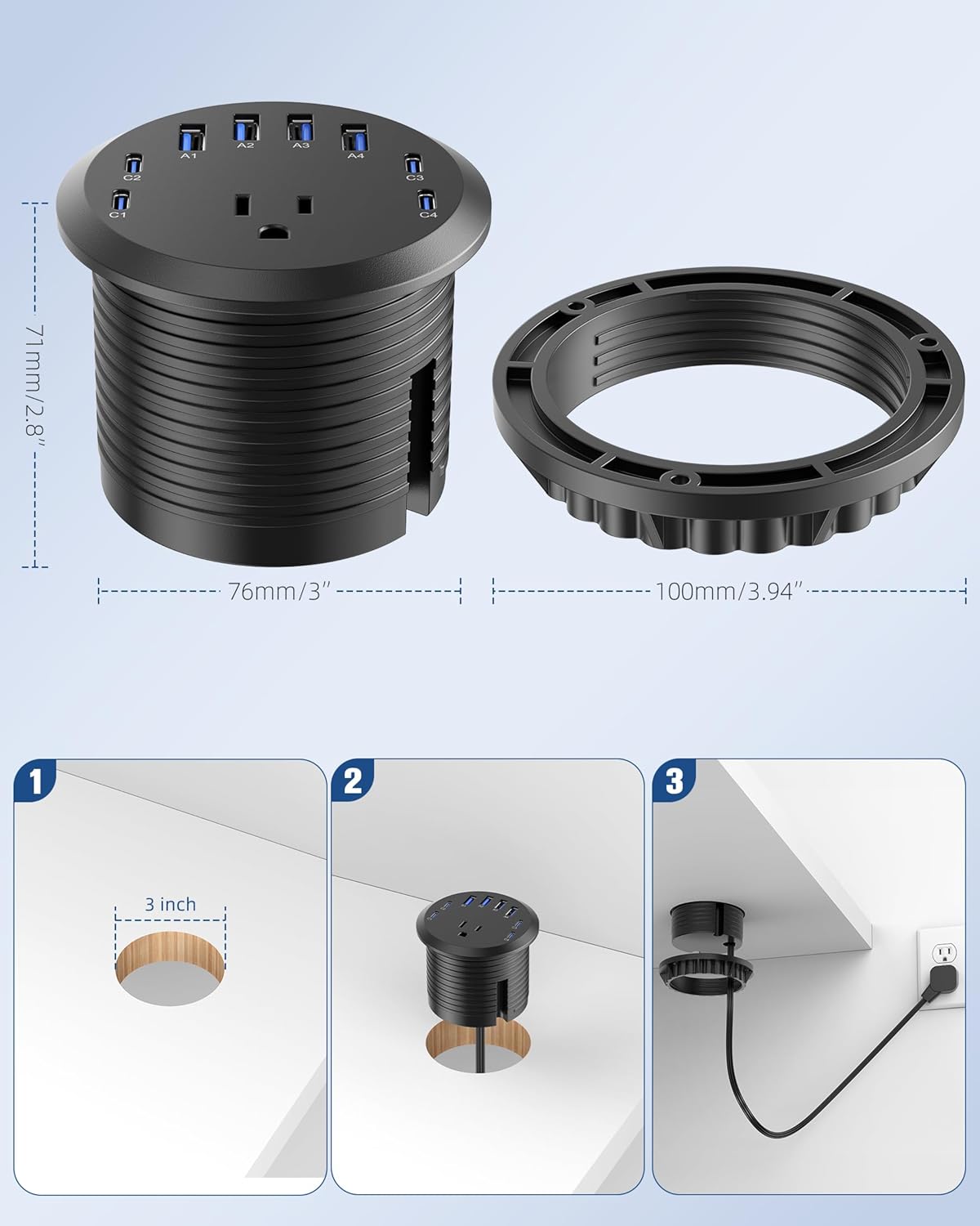 - Whether it's an uplift standing desk, a standard office desk, or a sofa side table, this 3-inch power grommet socket can be effortlessly installed. With surface-mount installation, it features a thickness of merely around 5mm and mounts nearly flush with any surface.