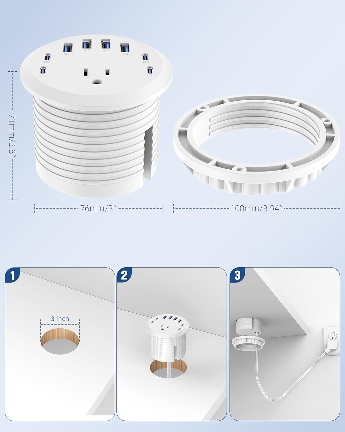 Jgstkcity 65W USB-C Hidden Desktop Power Grommet: 1 AC Outlet,8 USB Charging Ports,3'' Hole Flush Mount Pop-Up Power for Conference Tables & Nightstands (Whtie, 6 FT)