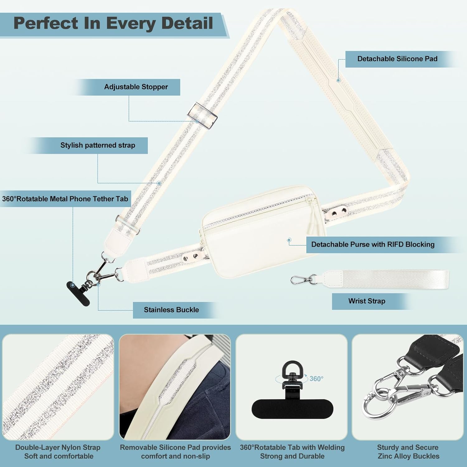 Clip and Go Strap for Phone with Wallet Crossbody, Adjustable Phone Lanyard with Detachable RFID Wristlet Wallet, Pattern Strap - Cream&Silver (L)
