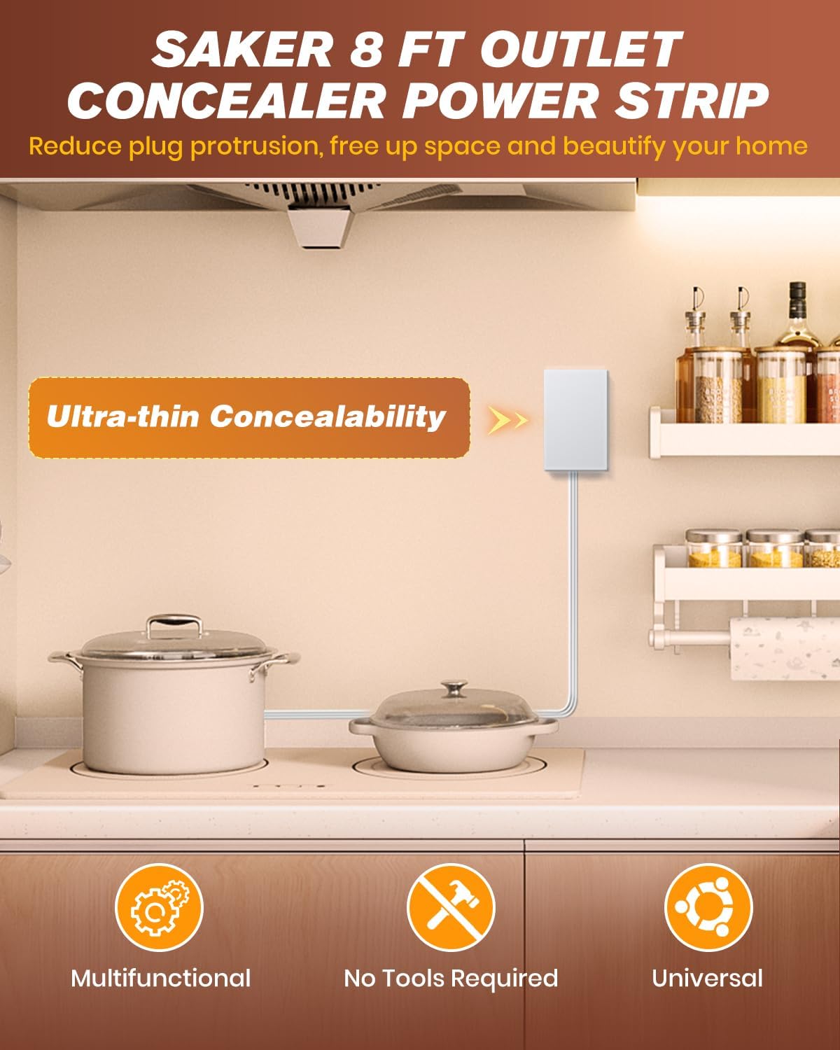 Saker Outlet Concealer Power Strip, 8FT Surge Protector Flat Extension Cord with 3 Outlets and 3 USB Ports, Outlet Cover Baby Proofing for Kitchen, Home and Office (8FT)