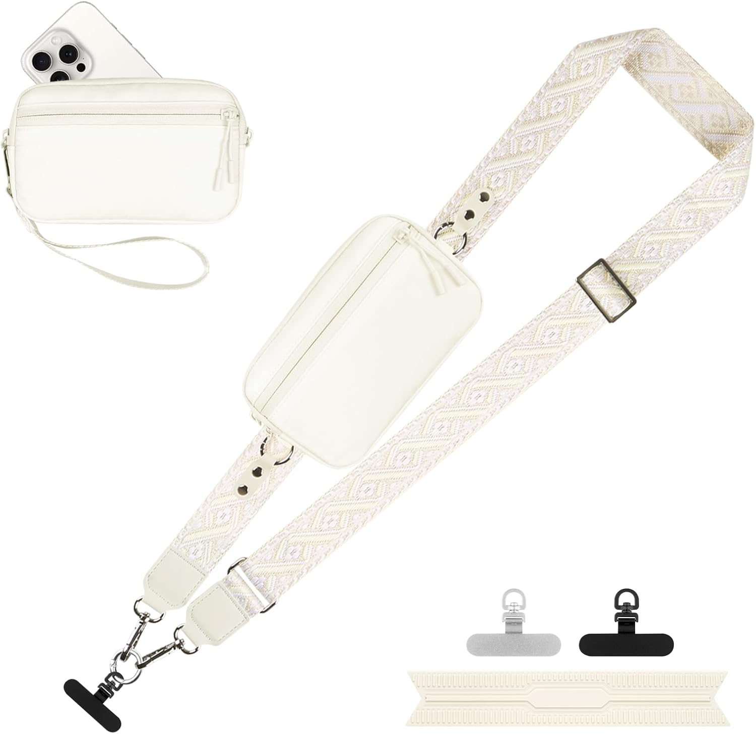 Clip and Go Strap for Phone with Wallet Crossbody, Adjustable Phone Lanyard with Detachable RFID Wristlet Wallet, Pattern Strap - Cream (L)