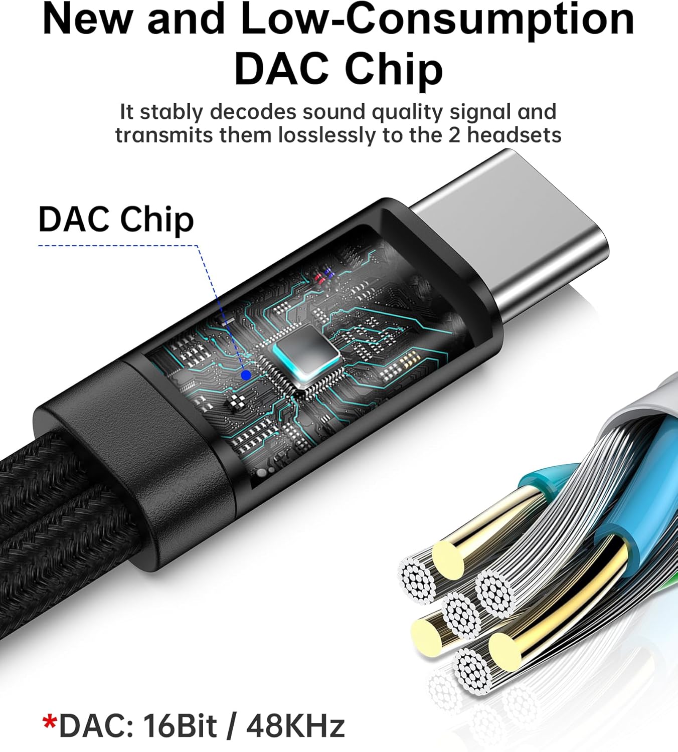 - 【High-Resolution Sound Quality】 The USB-C to dual 3.5mm audio splitter uses built-in newest and low-consumption DAC chip, which stably decodes 16bit / 48khz sound quality signal and transmits them losslessly to the 2 headsets you connected. You can enjoy clear, high resolution sound quality and ensure immersive audio for music, podcasts, and videos.
